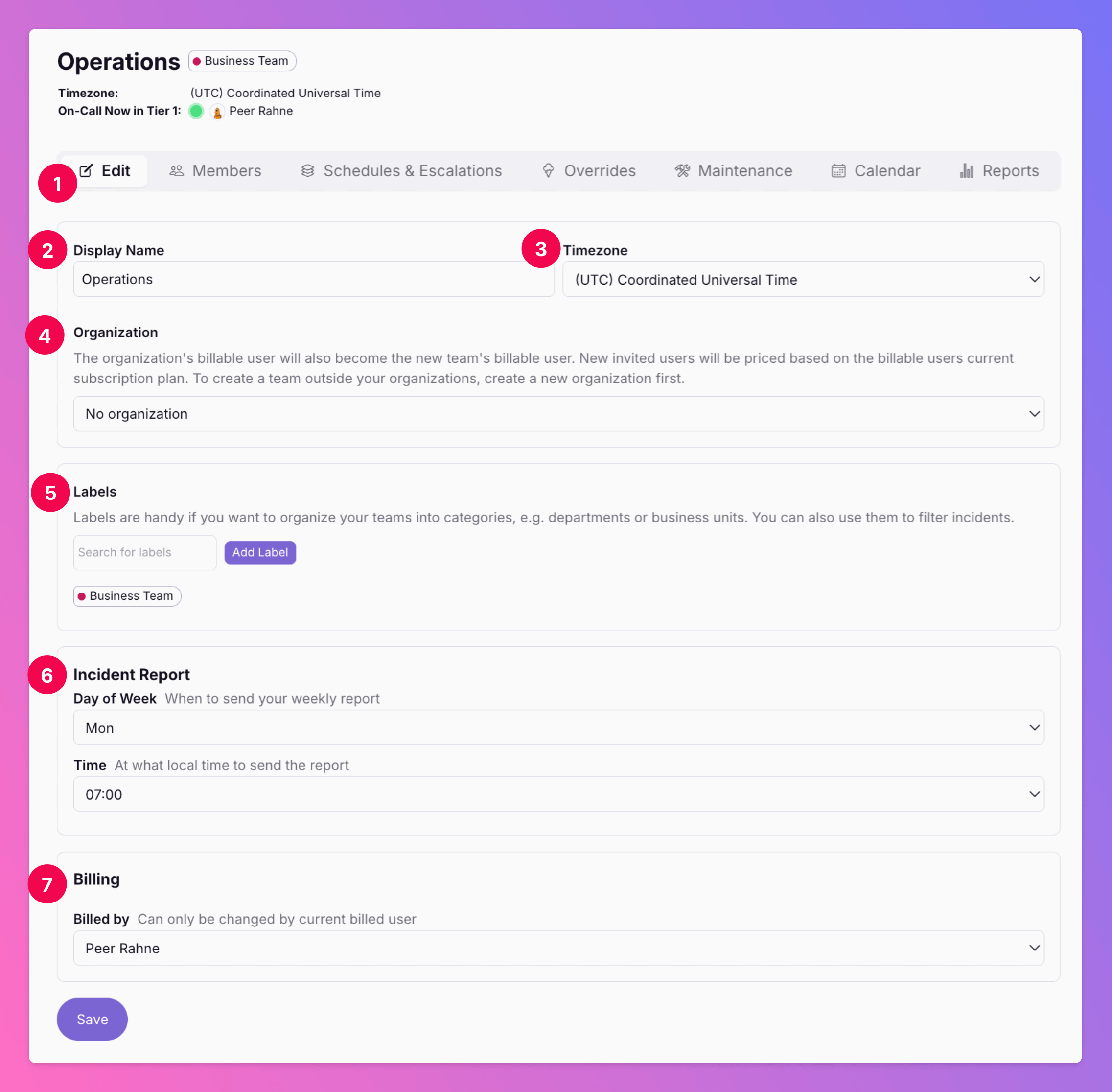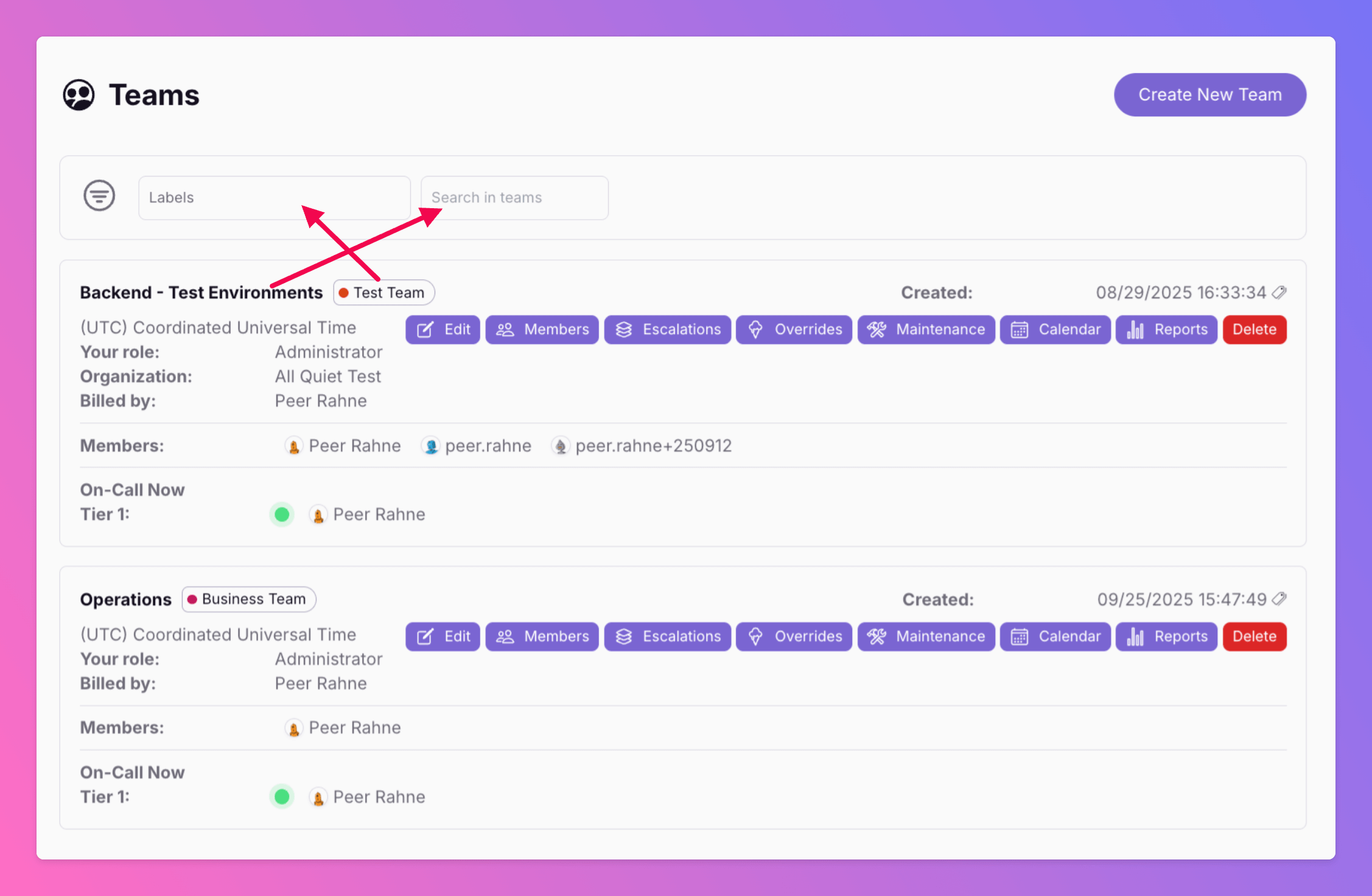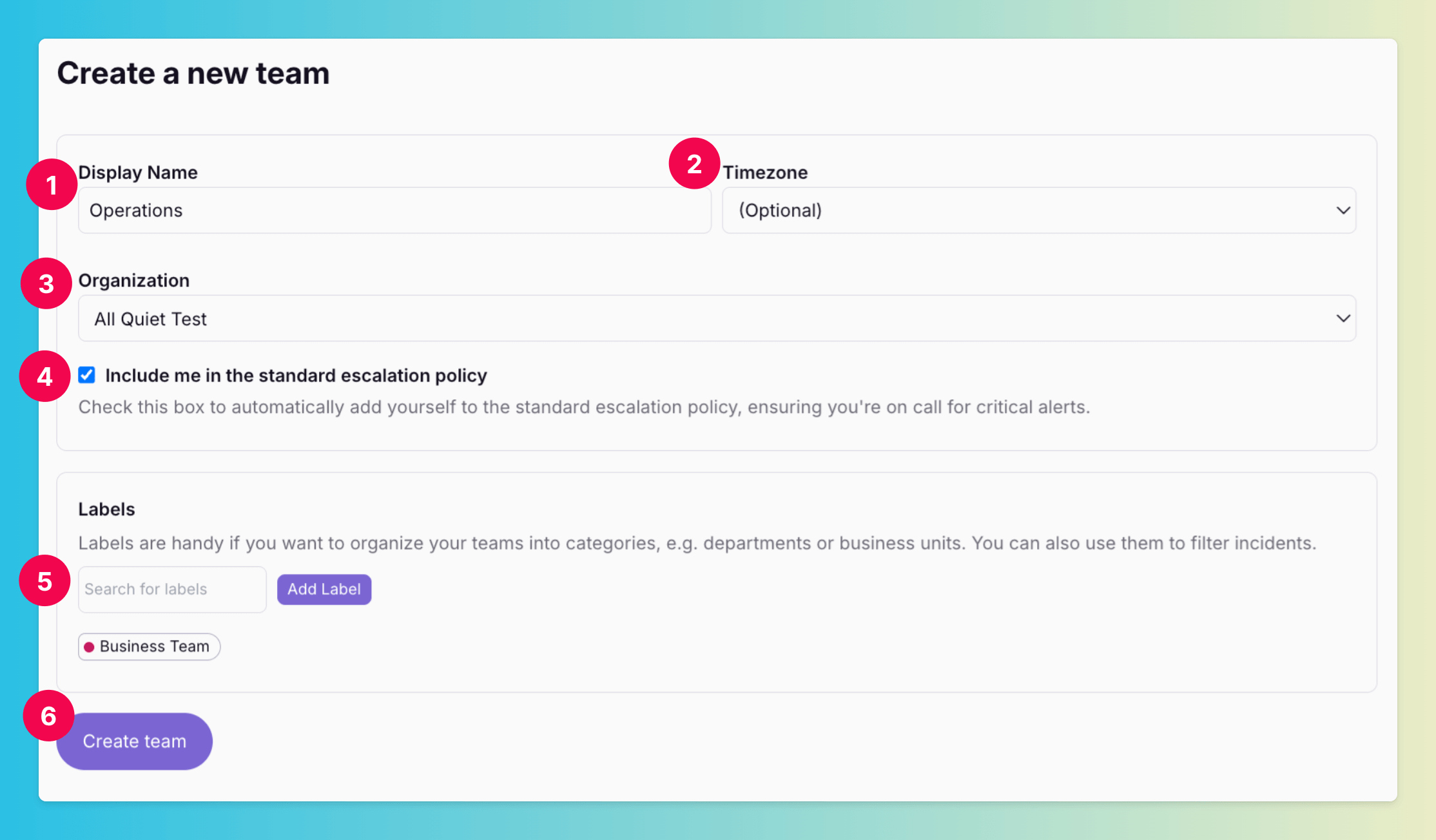 . This is handy if you want to organizae your teams into categories, e.g. departments or business units. You can use the labels to filter incidents, integrations and your team overview. - Hit