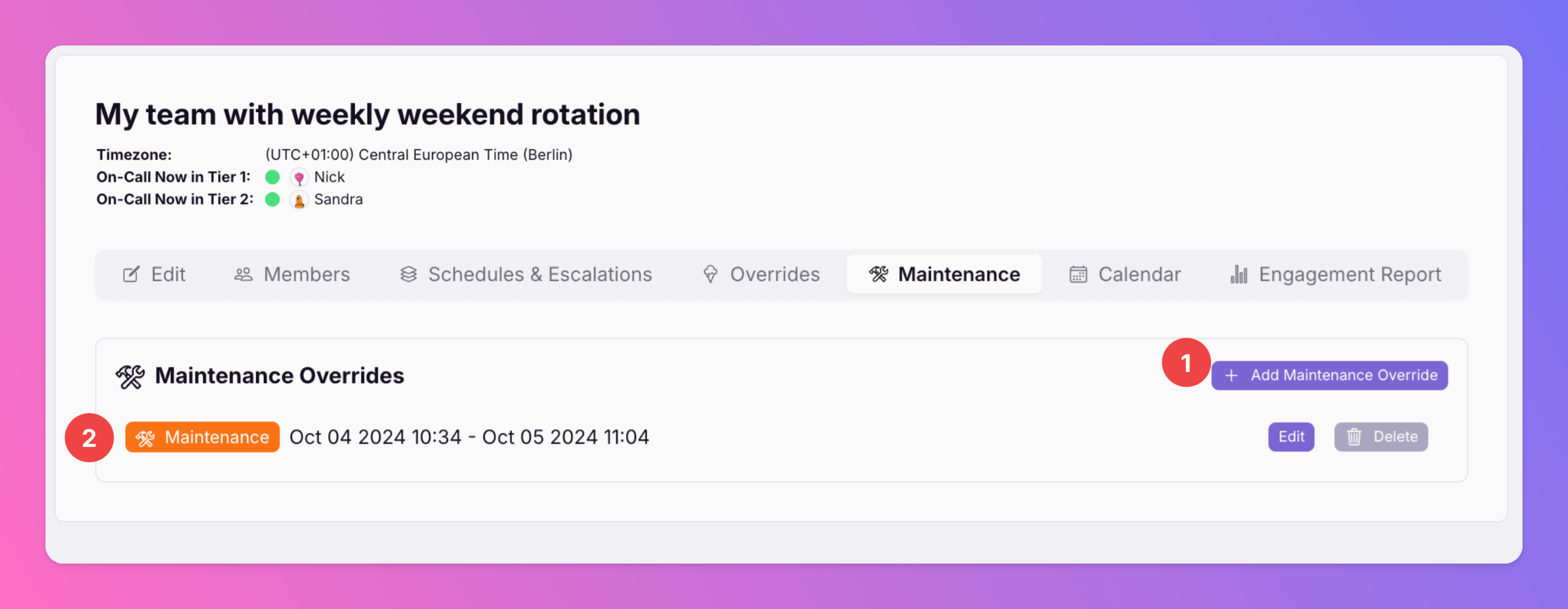 The maintenance mode feature for teams allows for the management of incident alerts during times of scheduled maintenance or expected downtime. It is accessible through theTeam > Maintenance