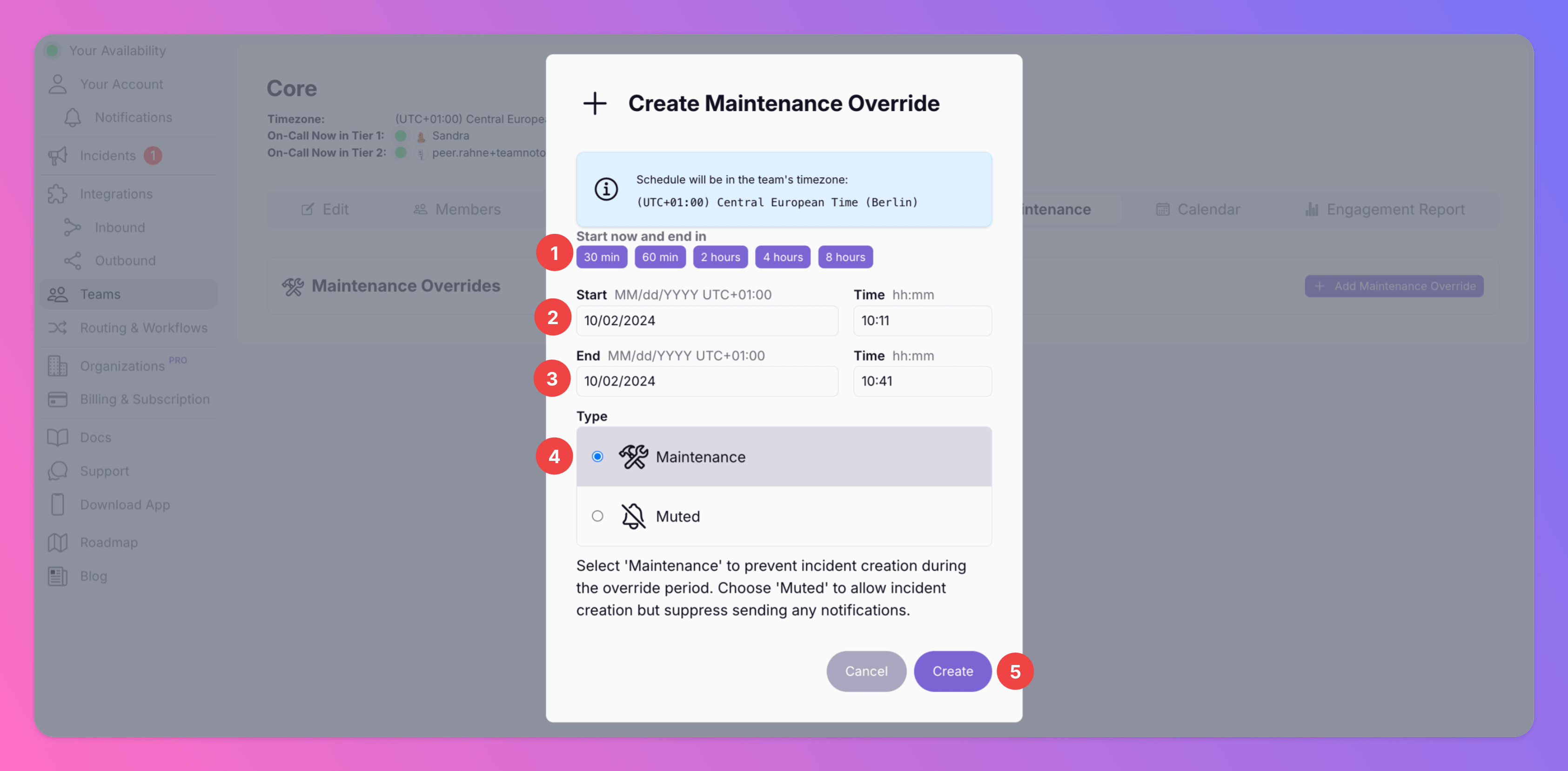 - Muted: This option allows incidents to be created without sending out any notifications during the period.