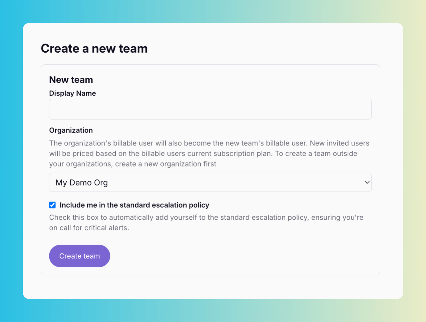 For more info about the on-call report, please read the Reports documentation.Creating a New Team in Your Organization
