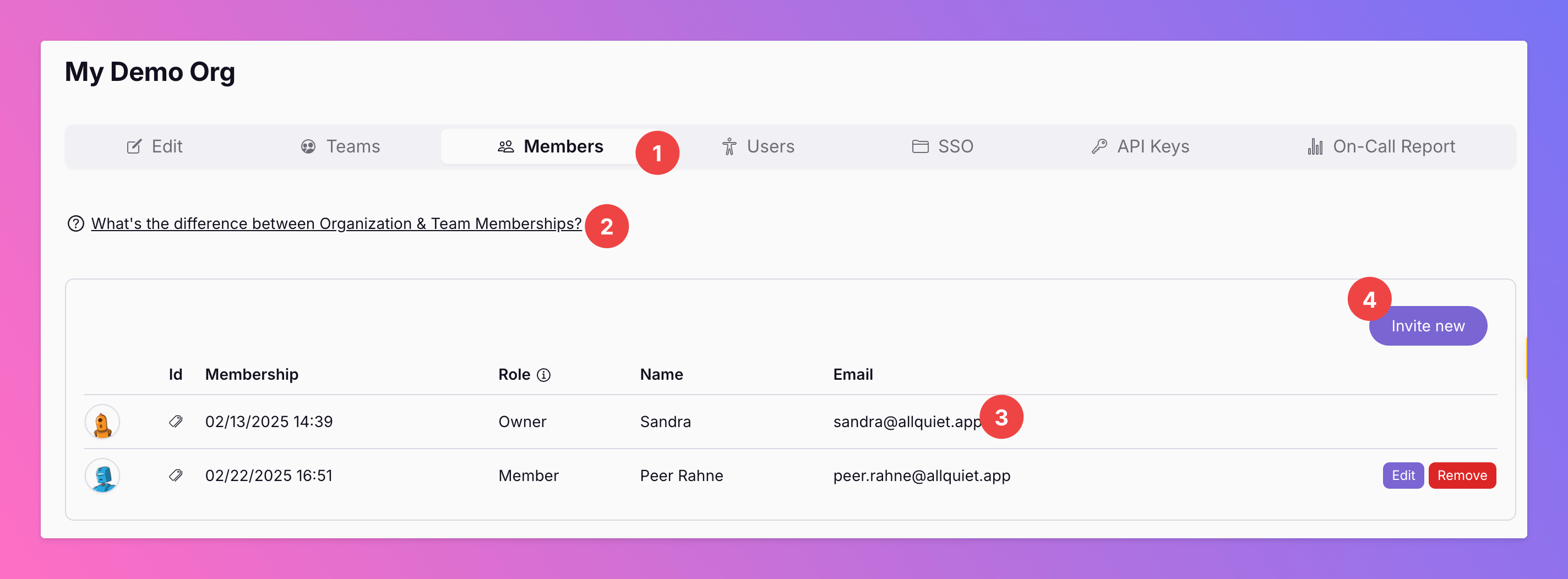 At All Quiet, Team and Organization Memberships are independent of each other. Users with Organization Memberships have rights for all teams within the organization, allowing them to interact with all incidents. However, they are not part of any schedules, escalations, or rotations, meaning they are never on-call. To include a user in a team’s on-call escalations, assign them a specific Team Membership in addition to their Organization Membership. Organization Members are not billed. Billing is based on the number of unique users with Team Memberships across all teams. You can view all billed users under “Billing & Subscription > Your current usage”.Setting Up Your Organization