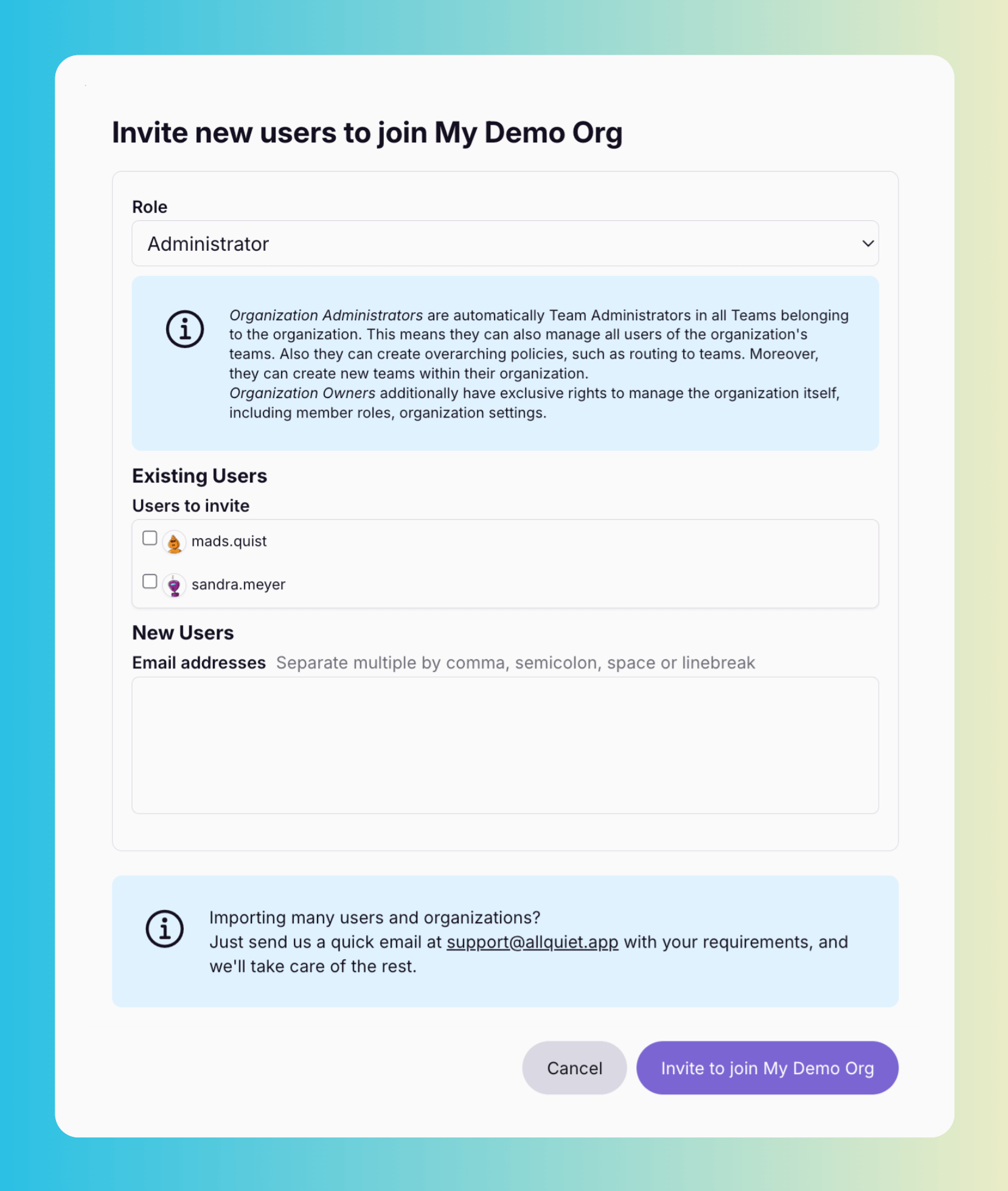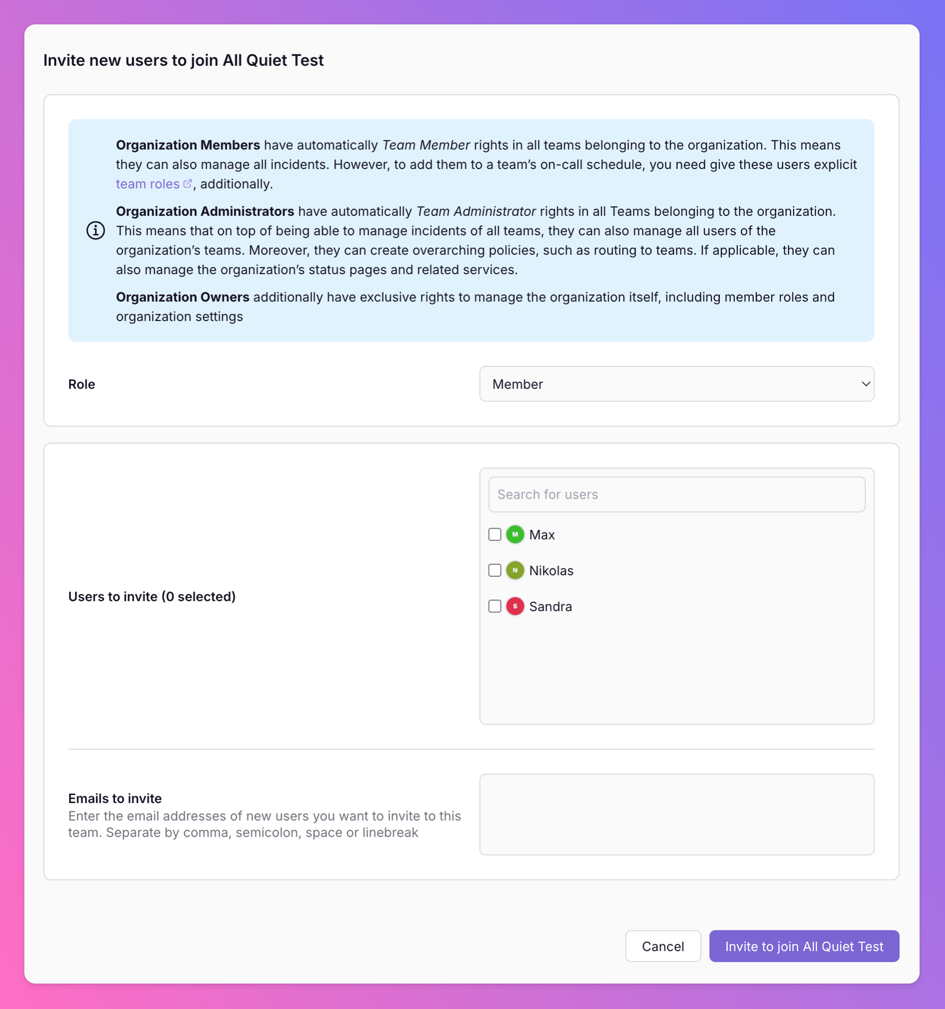 Invite new opens a layover to invite new members to your organization. You have the option to invite new users who are not yet part of All Quiet, or you can select from a list of users with whom you are already associated within the platform. You can also decide which role they should have in the Organization, Member, Administrator or Owner. Learn more about the difference, here.