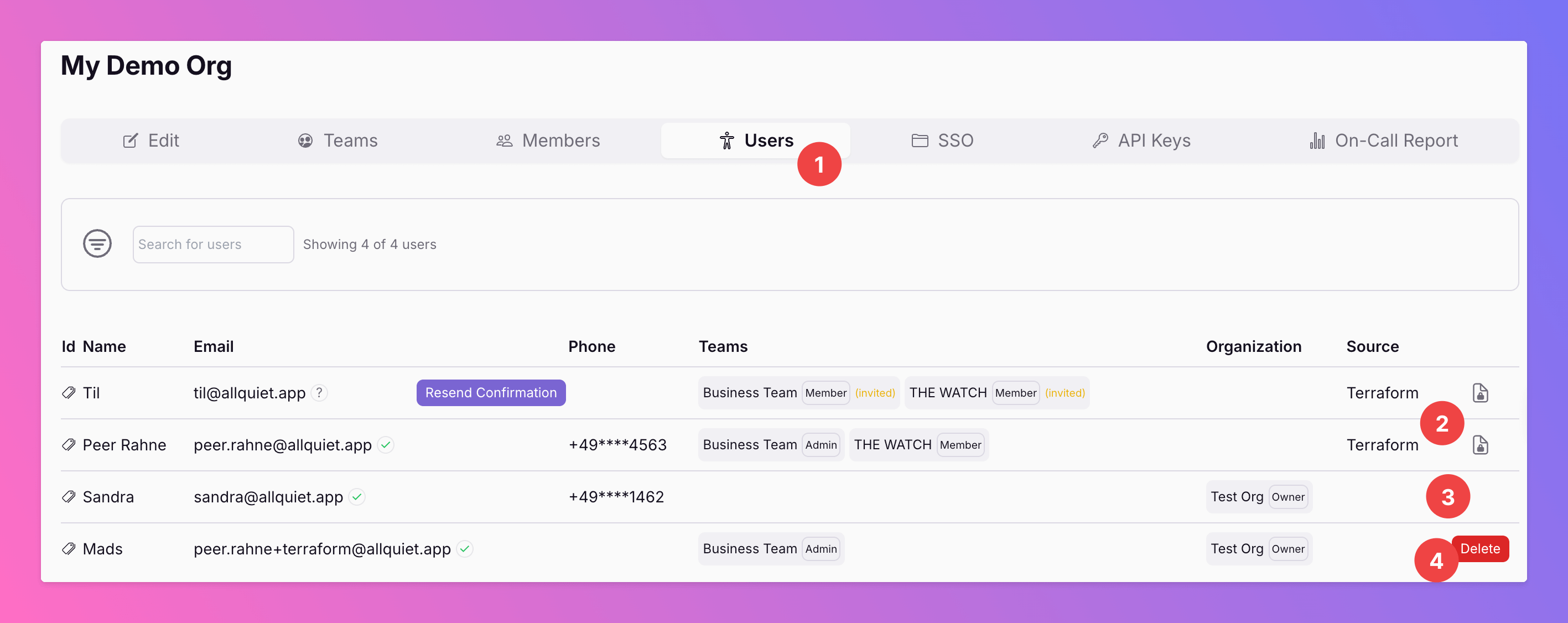 - When provisioned via SCIM or Terraform, you can only delete the users via their source, e.g. by removing them from the provisioned Groups in SCIM.