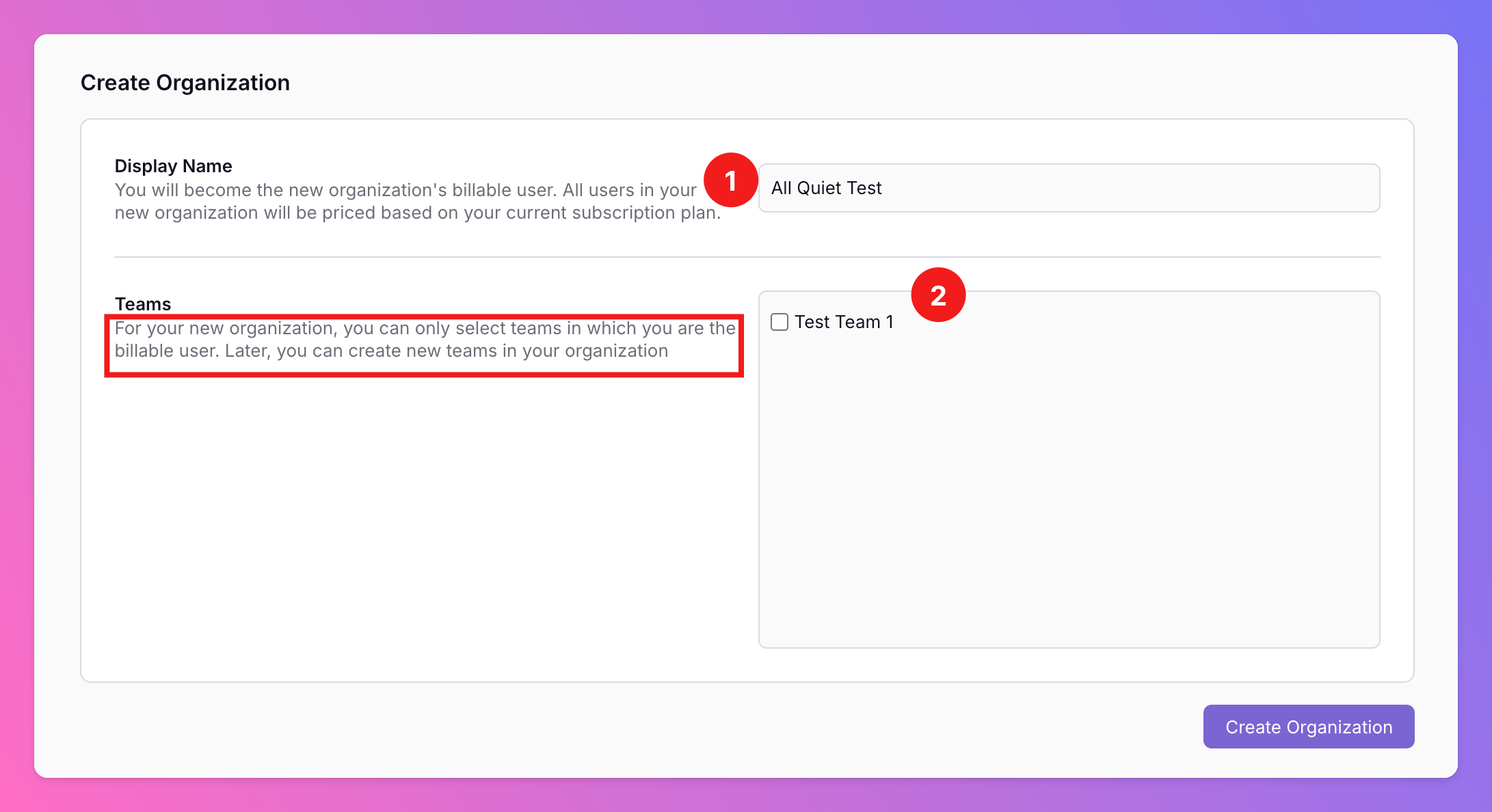 Display Namefield, such asMy Demo Org. - Next, select the teams you wish to include in your organization. Teams can be modified later through the team’s edit form or directly within your organization’s settings.