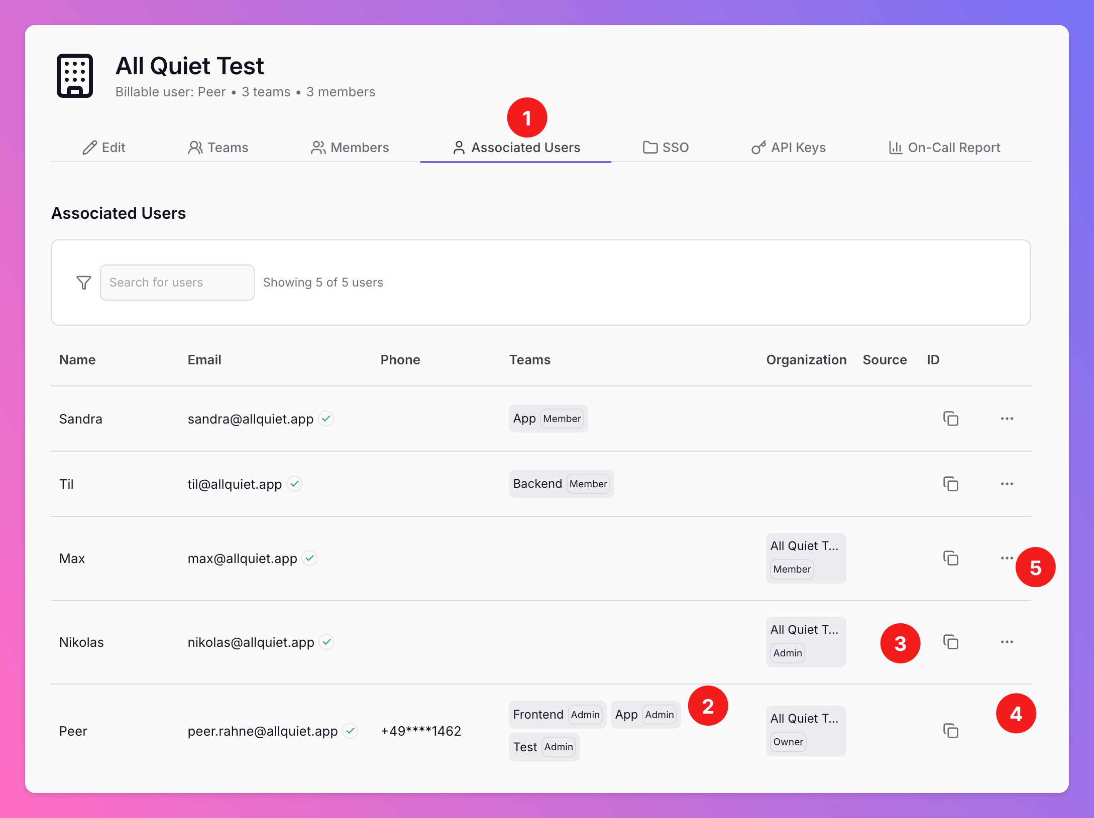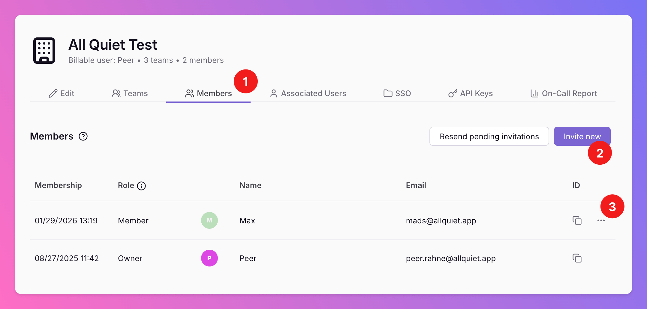 Deleteother users of your organization. If a user only has roles within this specific organization and it’s teams, their entire All Quiet account will be deleted and anonymized. However, if they have roles in other organizations or teams, their account will remain active — but they will lose all access to this organization’s resources.