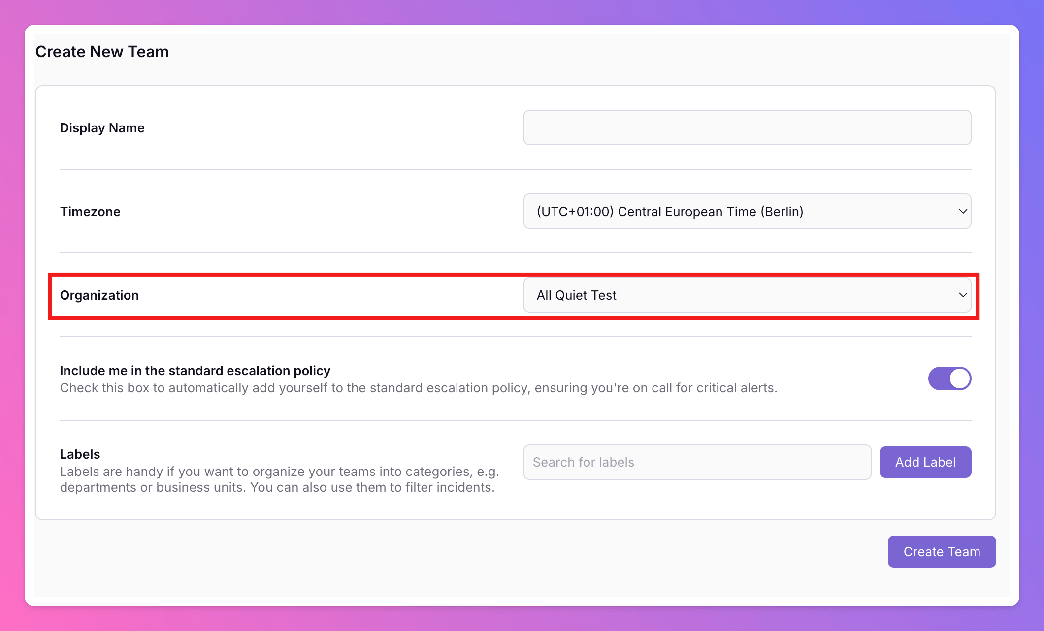 - Consider Your Needs: It is important to assess whether your current or anticipated team dynamics necessitate the advanced coordination capabilities that Organizations provide. E.g. organizations allow you to share one outbound integration amongst several teams. This allows you to send incidents from differenet teams within your org to the same slack channel, using the same integration.