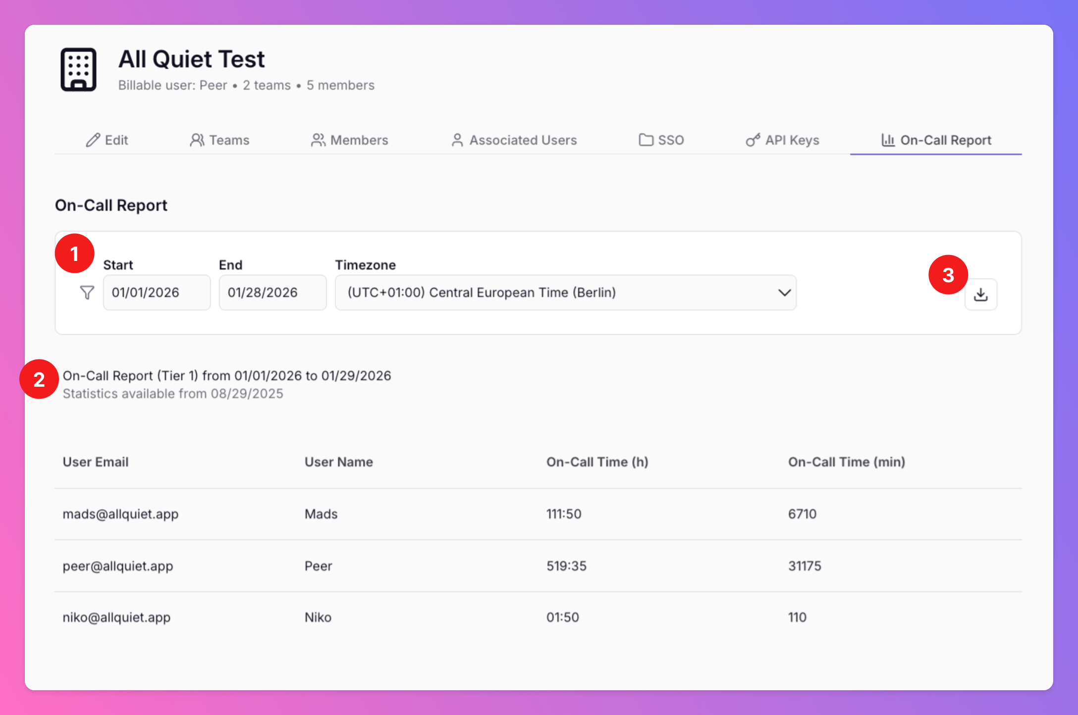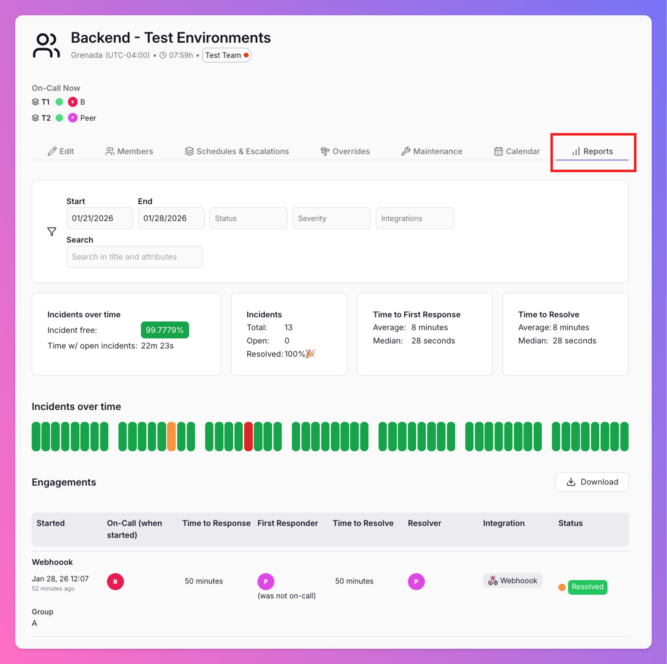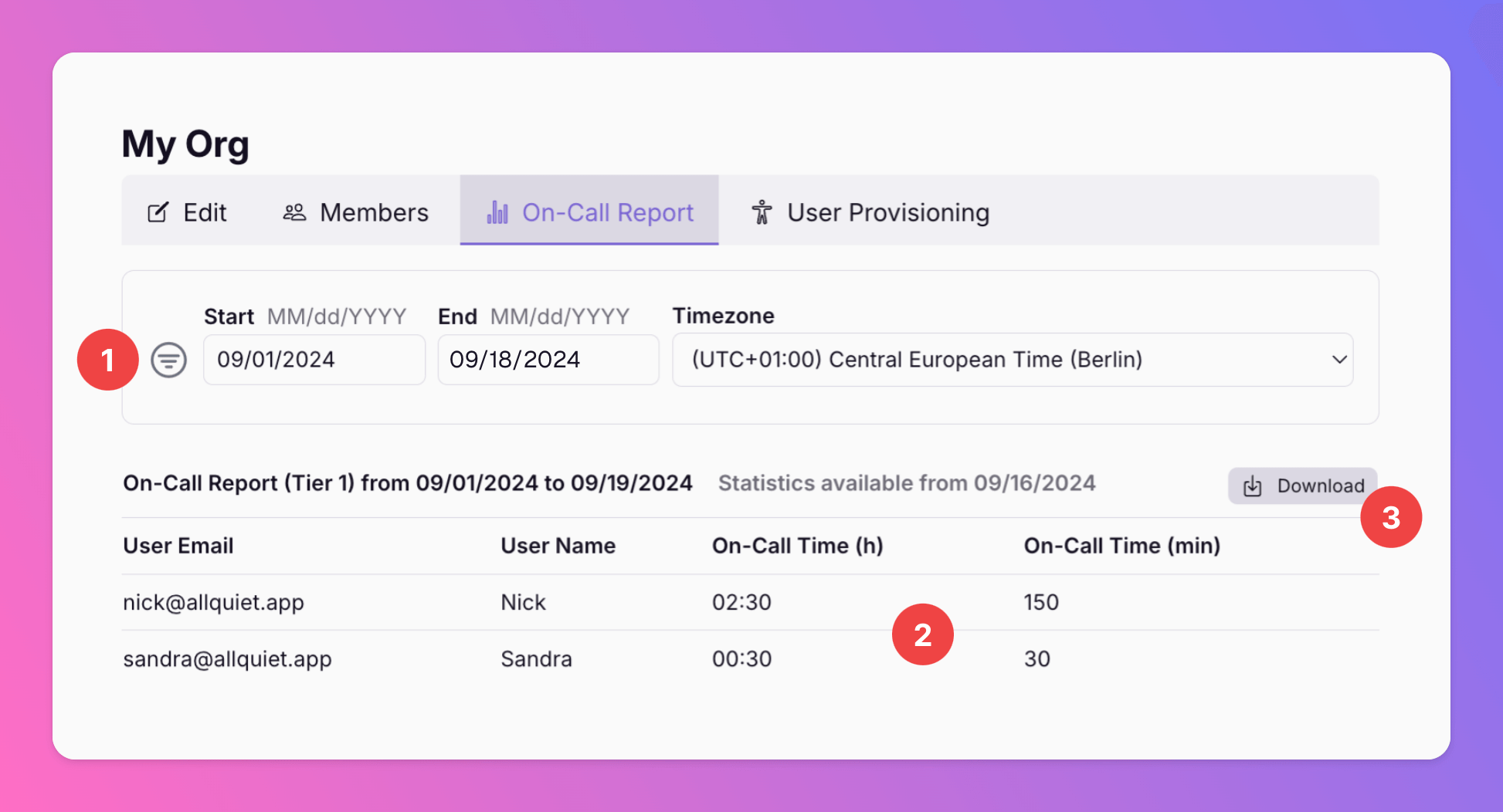 - Download button: Download a .csv of the on-call times for the selected time interval.