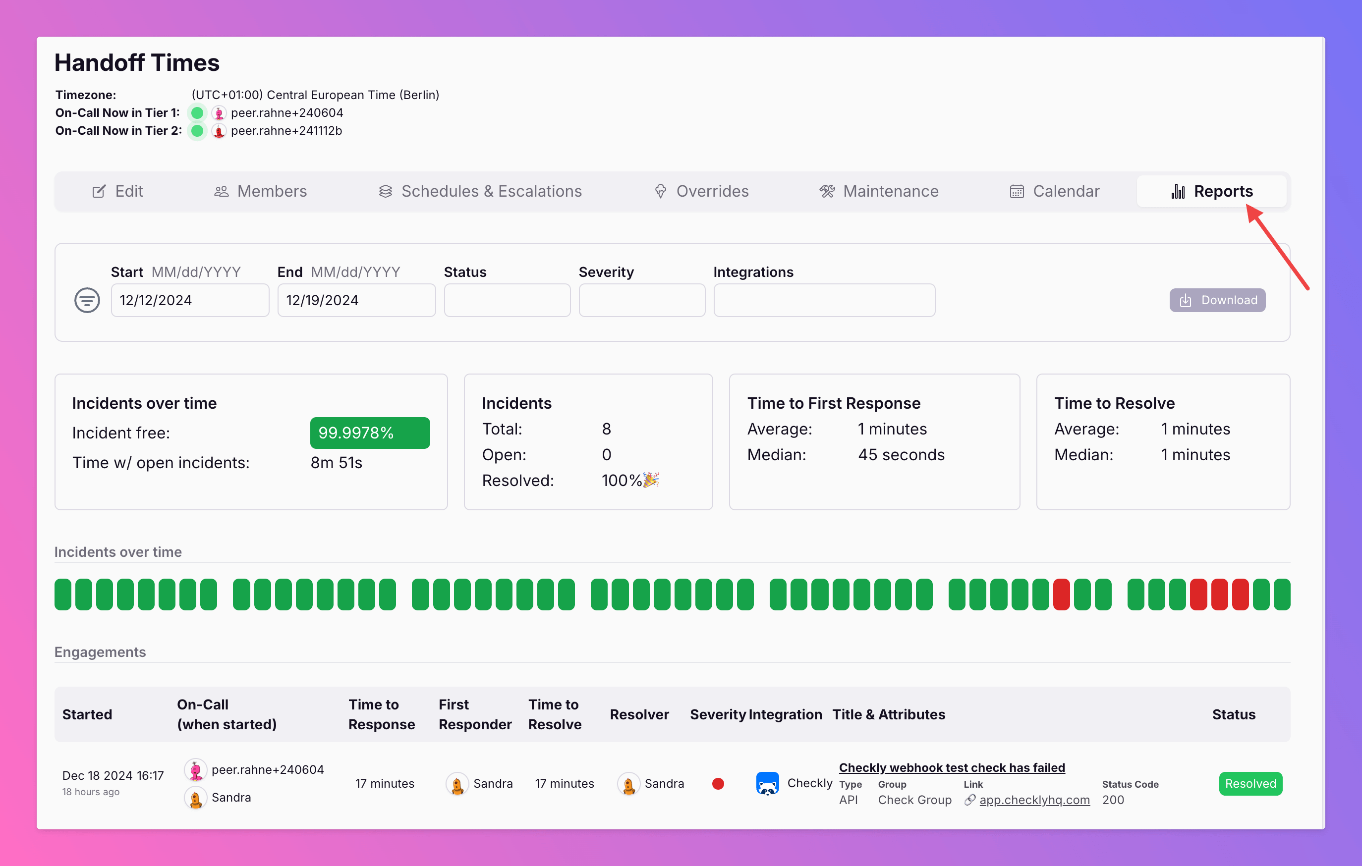 - The Report is available on-demand with flexible date selection and per default features all on-call times of the current month. The timezone can be used to further fine tune the observed interval. If you have users living in different timezones, this feature helps to determine their actual on-call times for e.g. the month according to their timezone. This can be pretty important for payroll purposes.