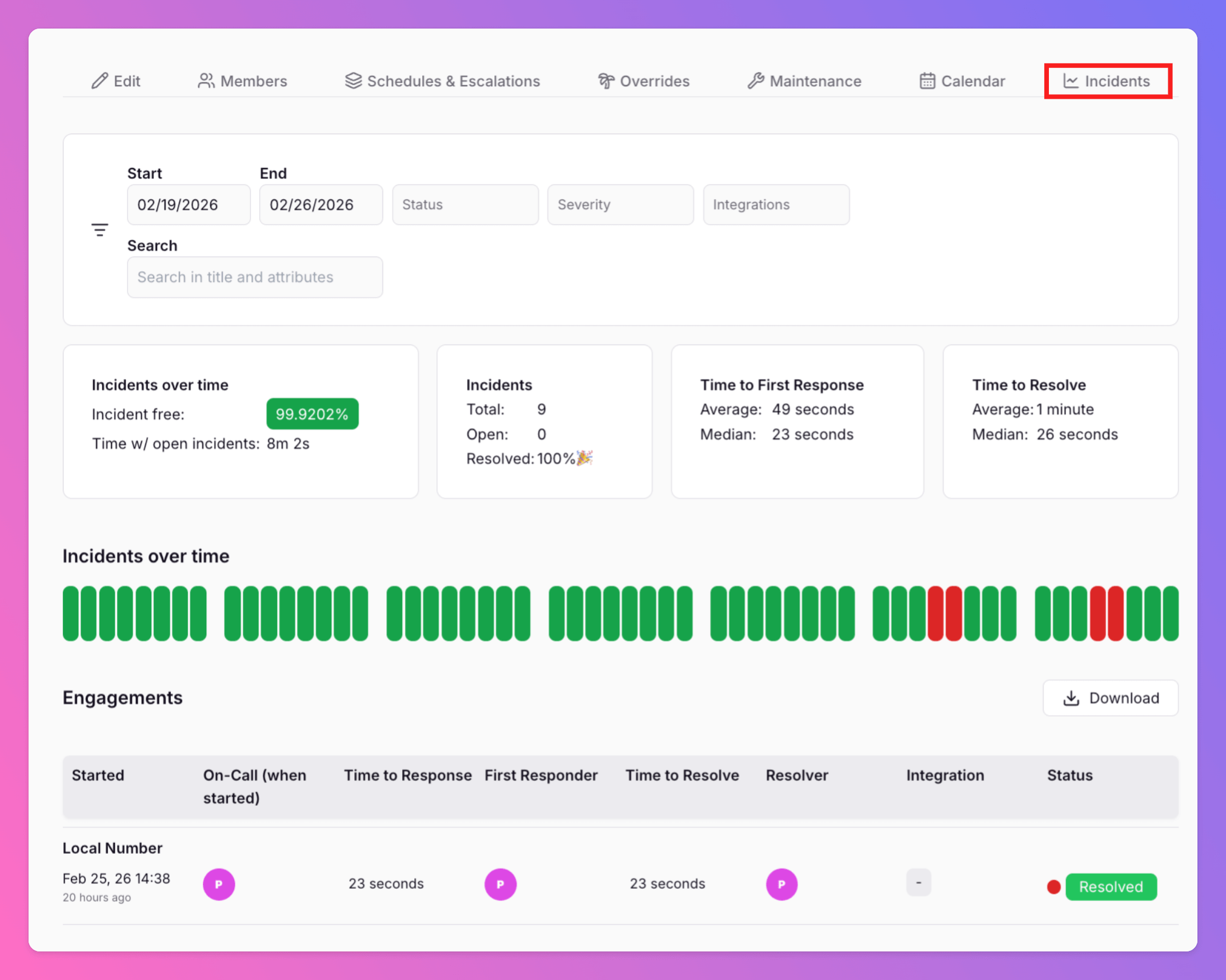 - Performance Metrics: Average and median response and resolution times, with details on individual incidents.