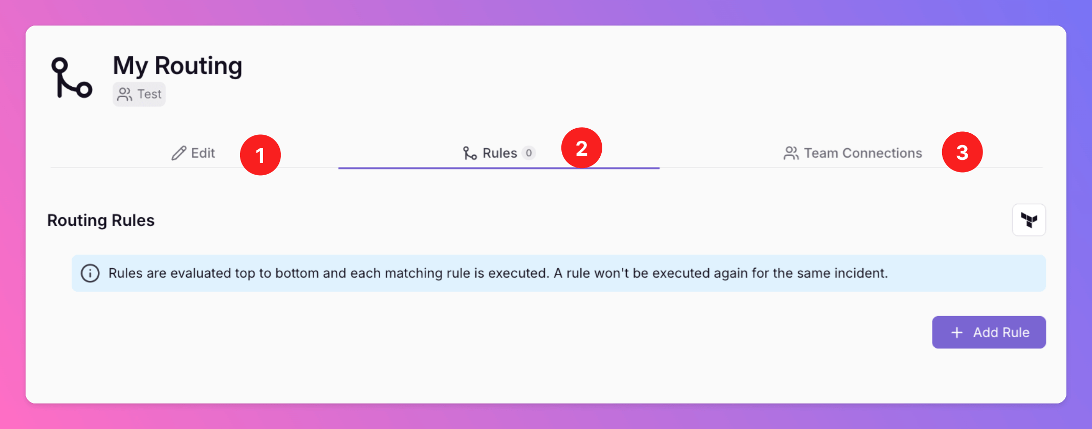 Edit, where you can change the Routings Display NameRules, where you can add the actual routing rules.Team Connections, where you can manage the connected teams.