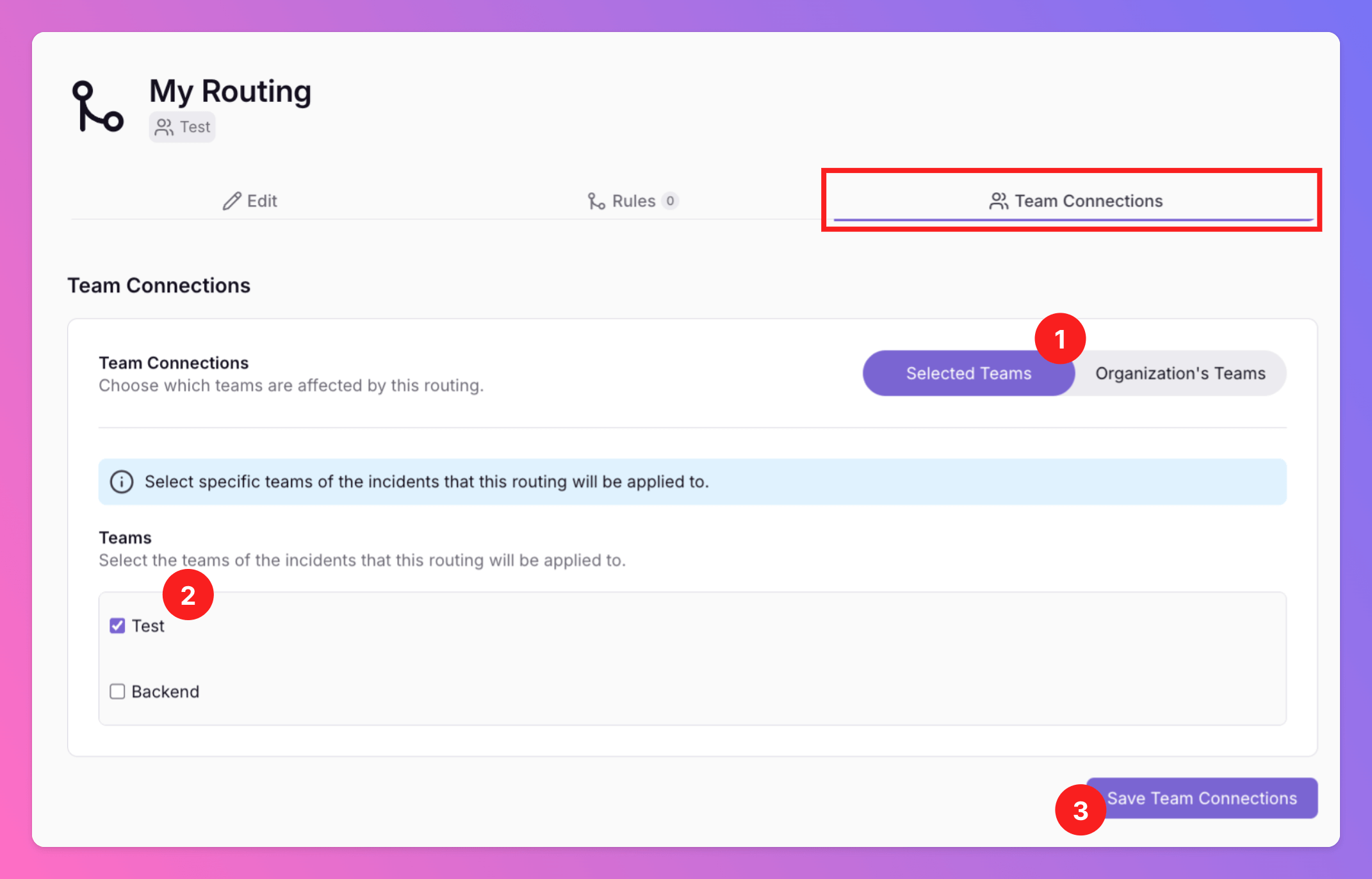 Team Connections, you can see that the routing’s Root Team is pre-selected. You can add the routing to further Teams within the root Team’s organization. Team Administrators can add / remove those Teams they are an admin in, Organization Administrators & Organization Owners can manage the connections to all Teams of the Organization.