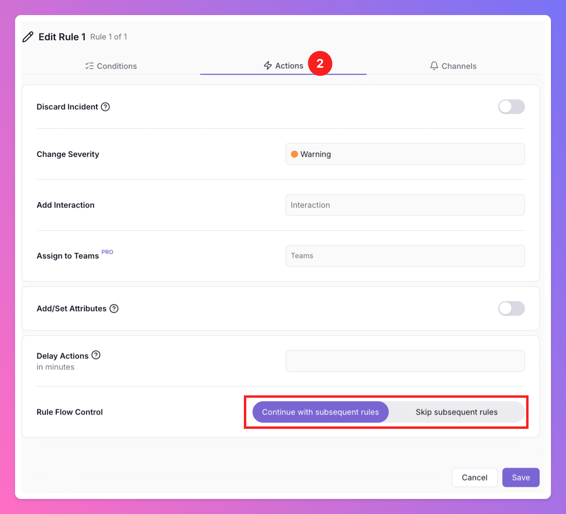 - Rule Flow Control: Decide whether to continue with subsequent rules or whether all subsequent rules should be skipped if this rule is triggered.