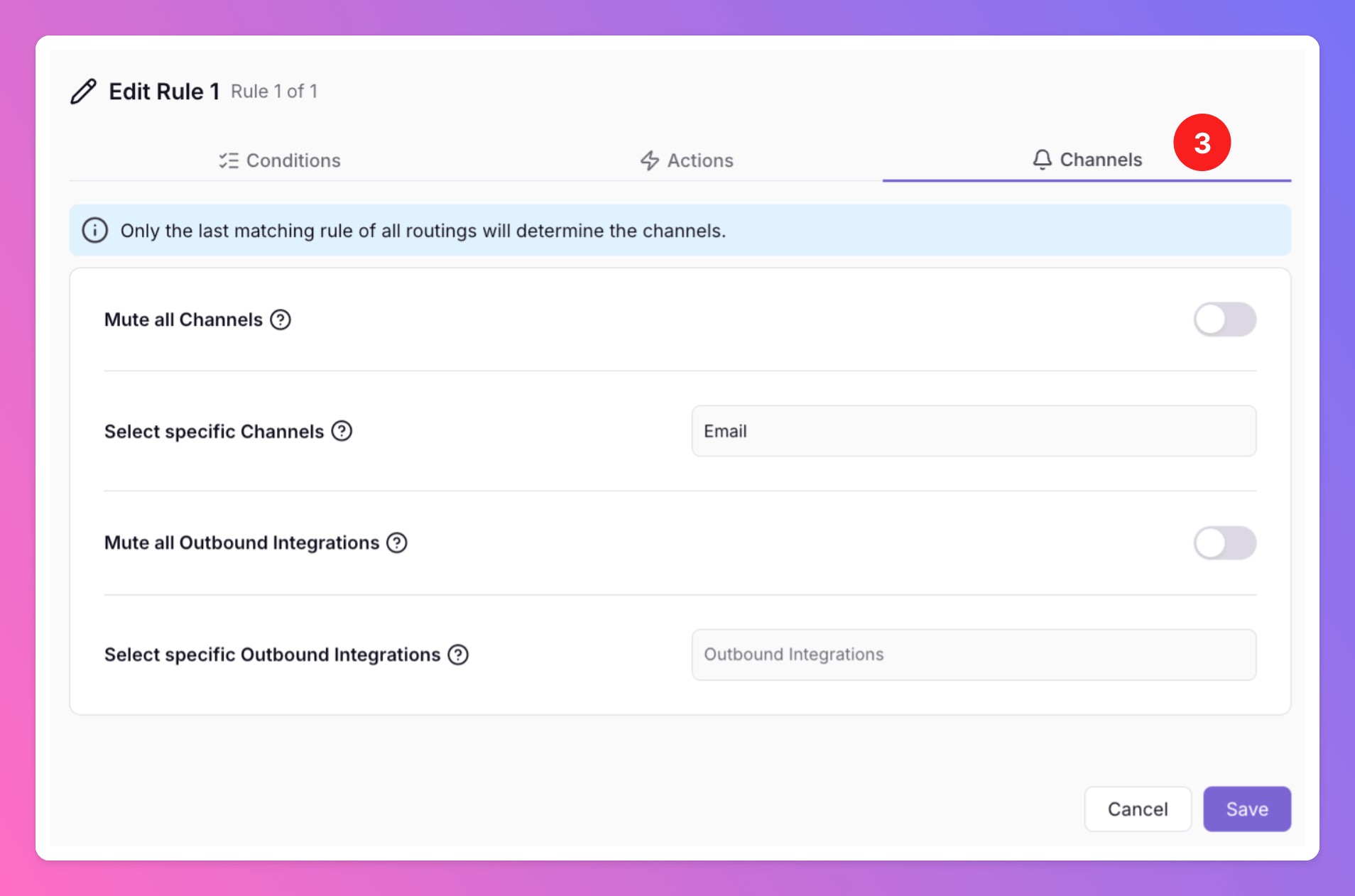 Determine how notifications are sent out by configuring Channels based on the Conditions:- Mute all Channels: Silence notifications across all channels (not including outbound integrations, see below).