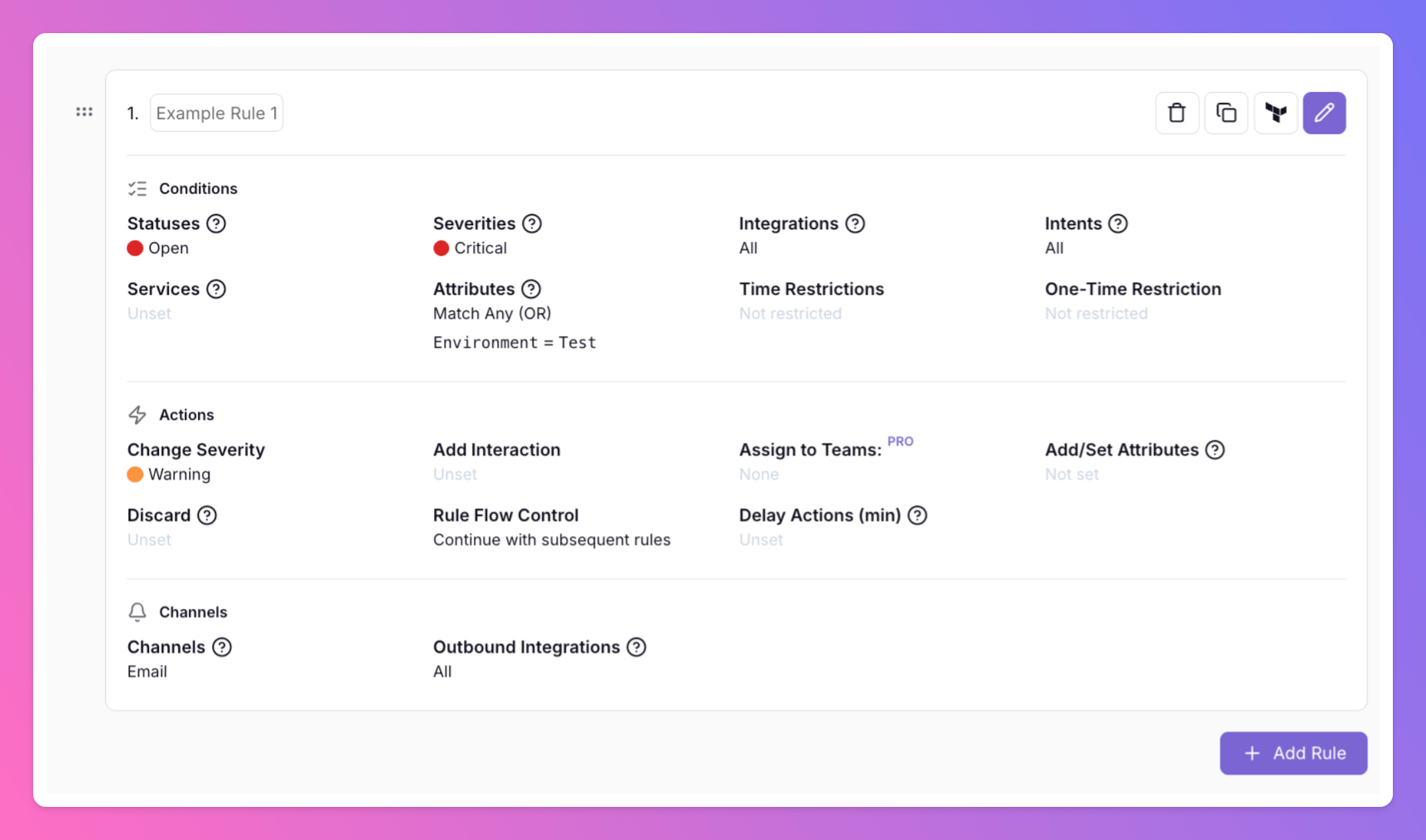 You can add multiple rules and connect them with eitherContinue with subsequent rules or Skip subsequent rules. Rules are evaluated top to bottom and each matching rule is executed once per incident. The order can be changed per drag-and-drop, anytime. You can edit, clone or delete individual rules and reorder the rules you have defined to create custom workflows and make All Quiet work for your team.