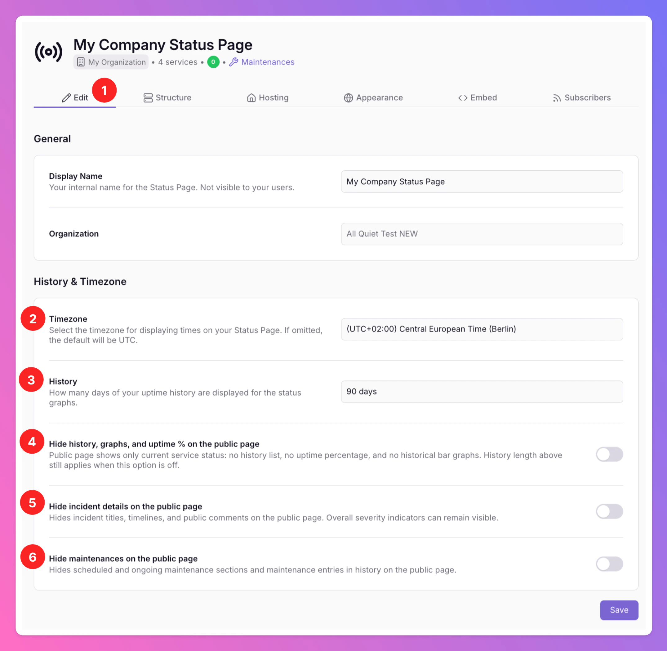 Next, you will find the following menu:- There are six different tabs to configure your Status Page, Edit, Structure, Hosting, Public Appearance, Embed and Subscribers. In the Edit tab, you will find the information you entered to create the Status Page. You can change it anytime.