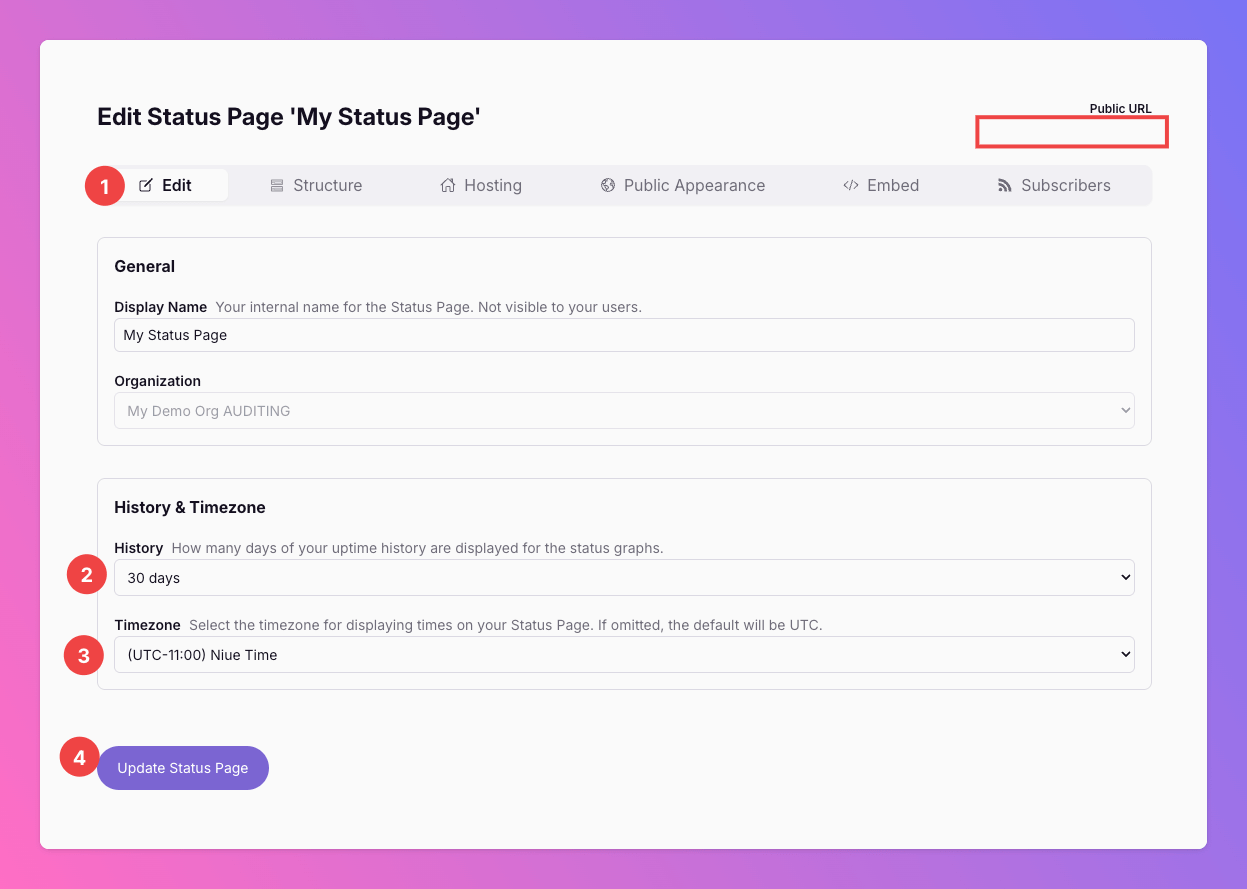 Next, you will find the following menu:- There are six different tabs to configure your status page, Edit, Structure, Hosting, Public Appearance, Embed and Subscribers. In the Edit Tab, you will find the information you entered to create the status page. You can change it anytime.