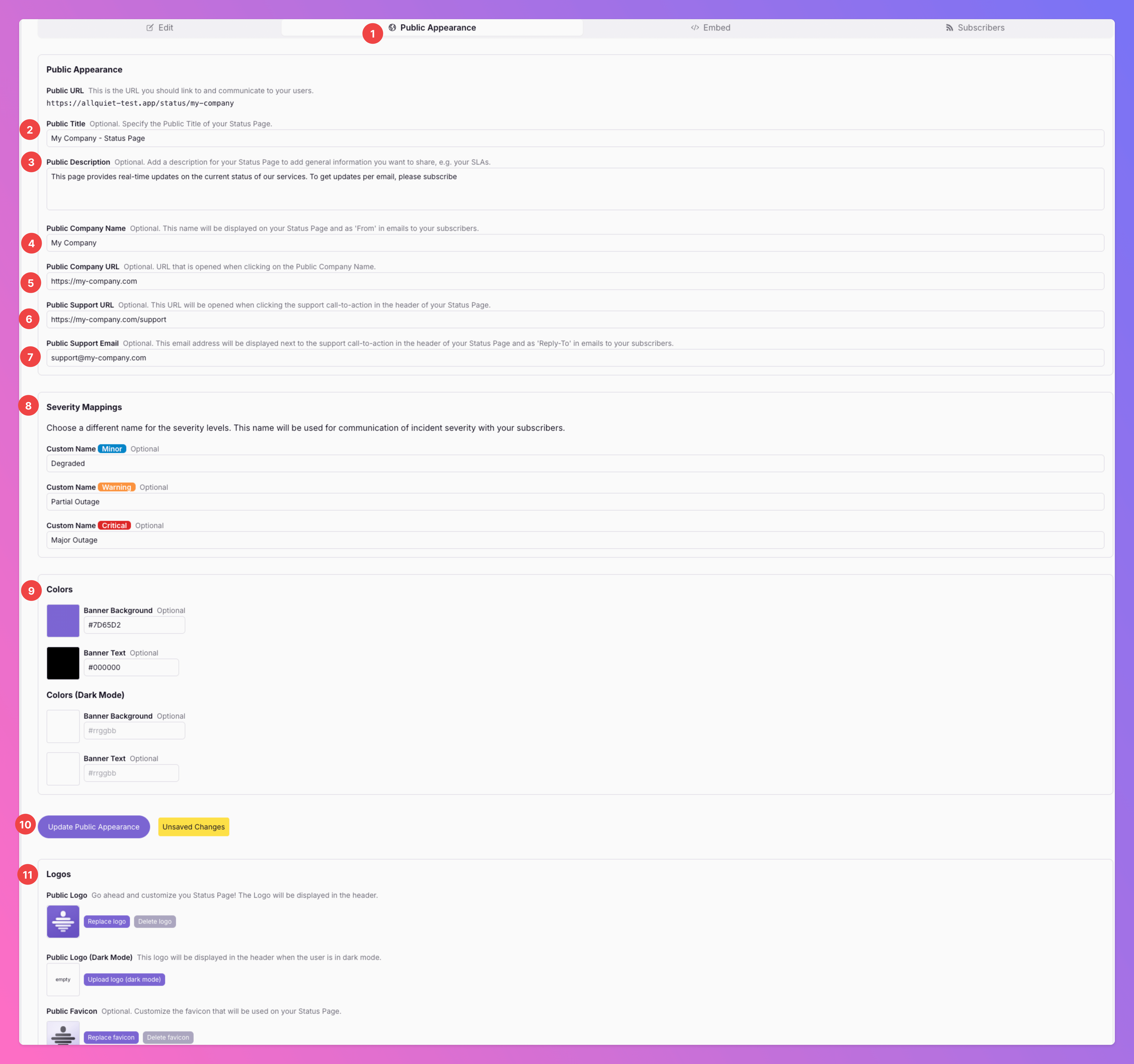 Here’s how you can configure and change the public appearance of your status page.- Select the