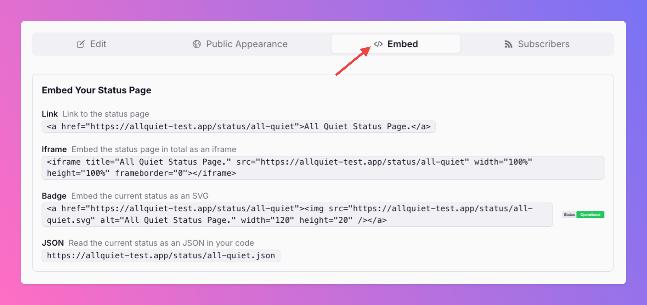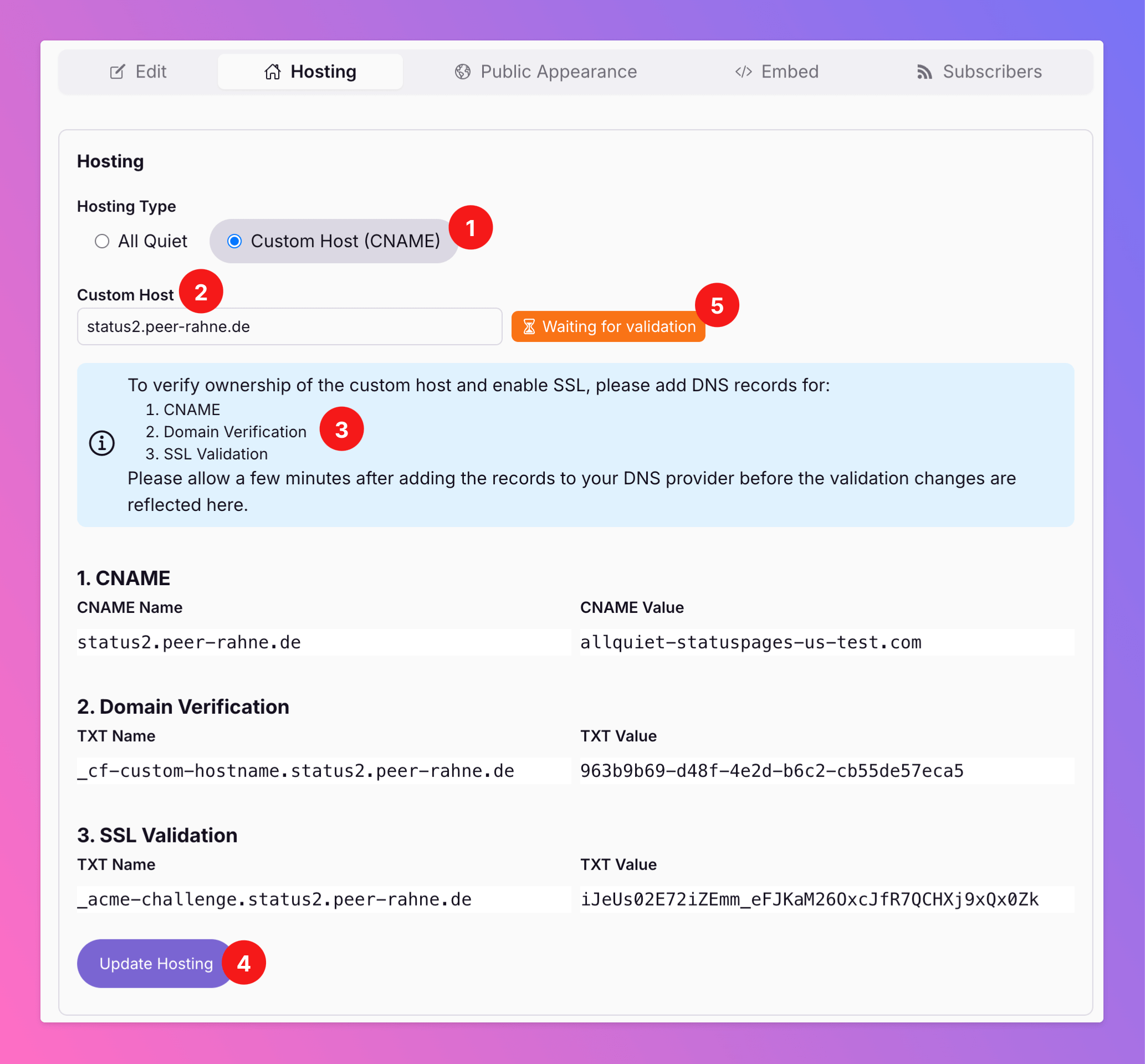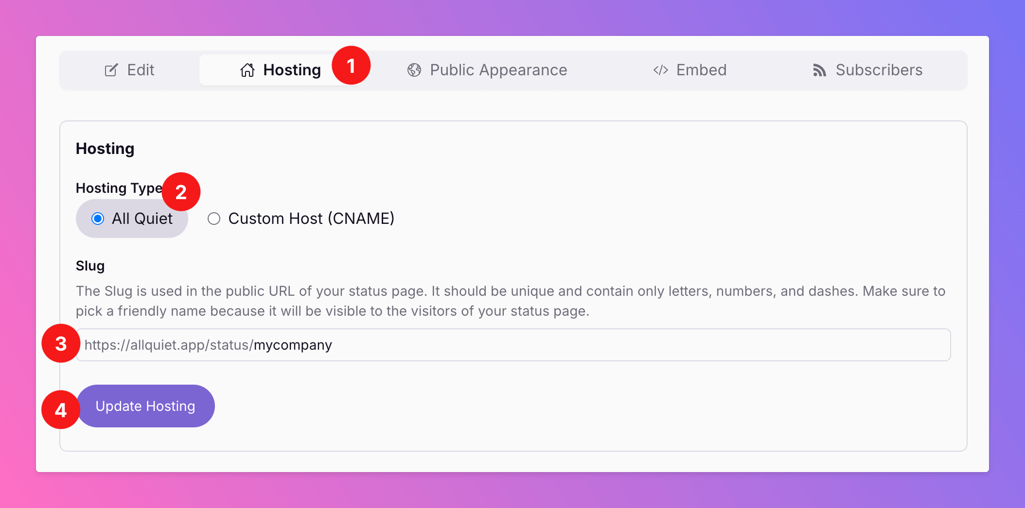 You can either host your status pages on our domain or host them on your own custom domain (cname).Hosted on All Quiet