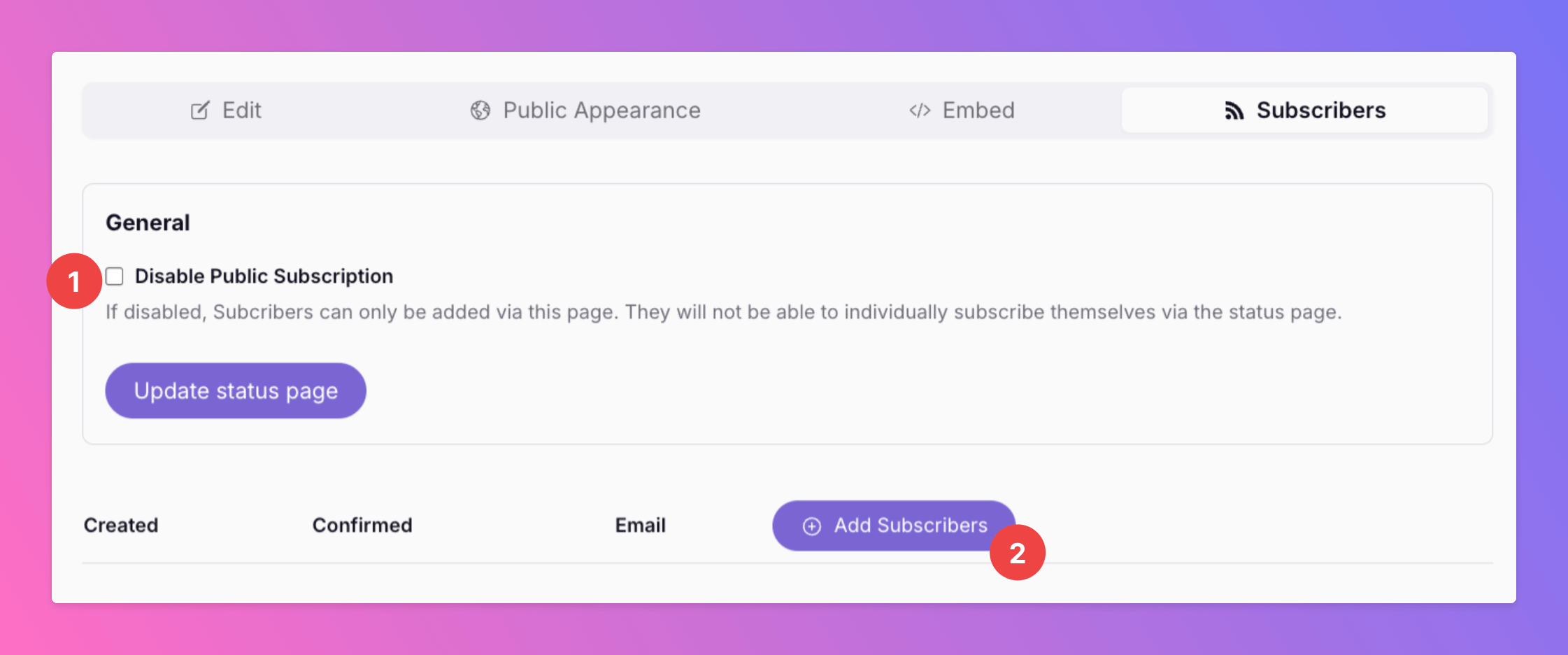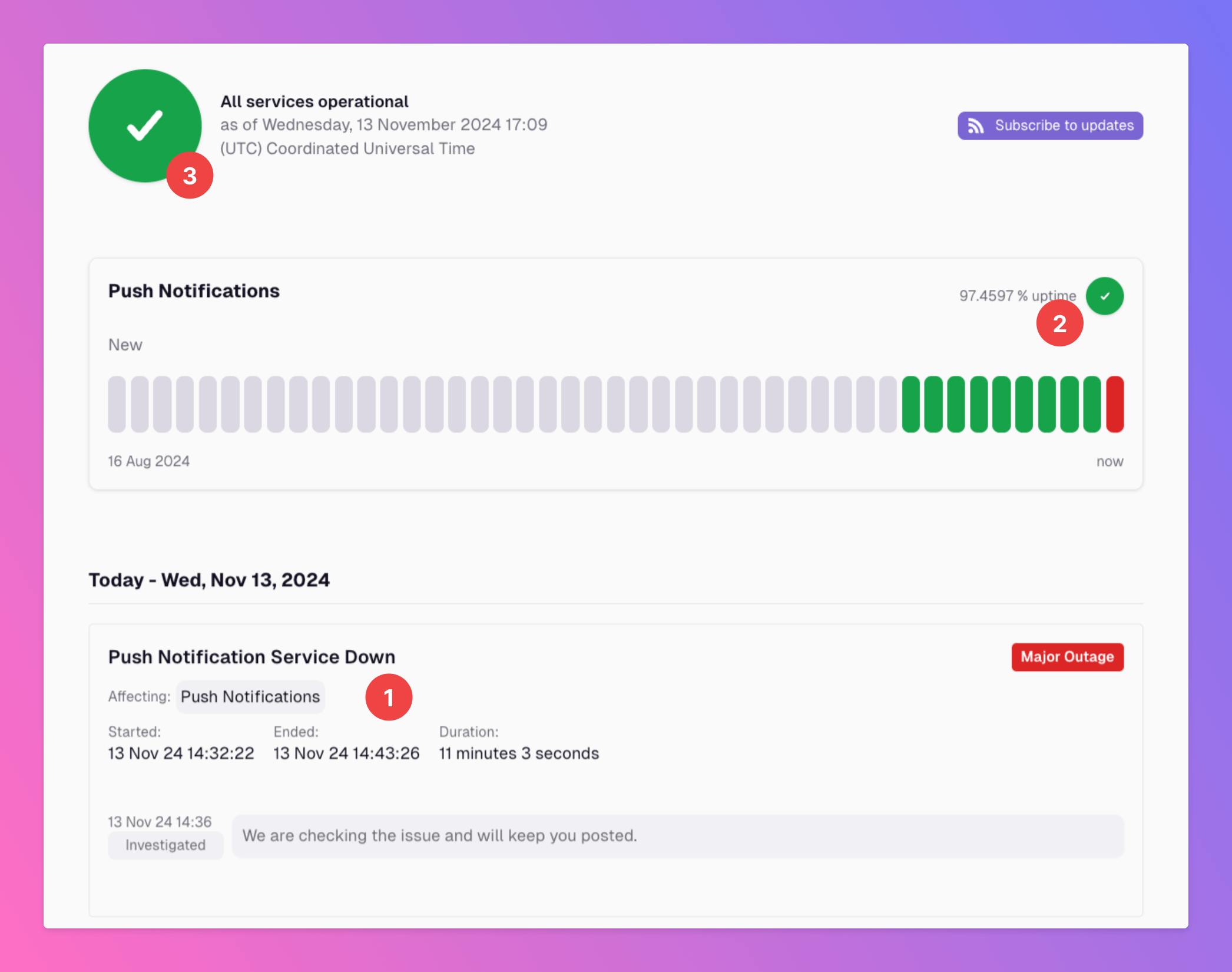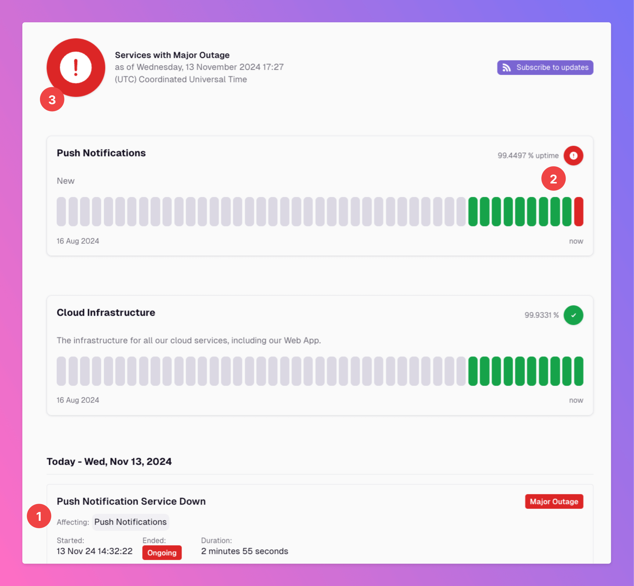 button, only visible when public subscription is enabled. - The current status of the services listed on the status page.