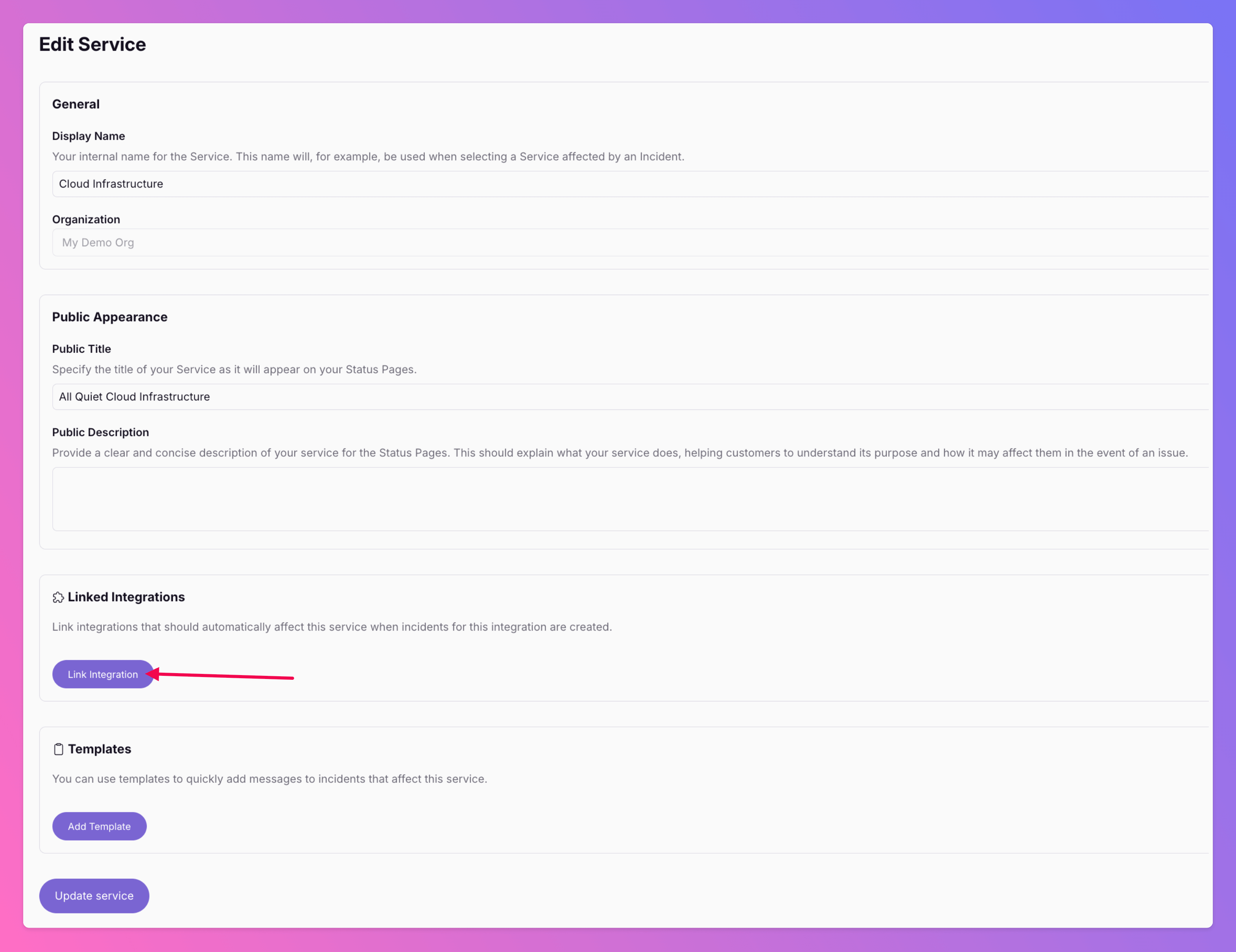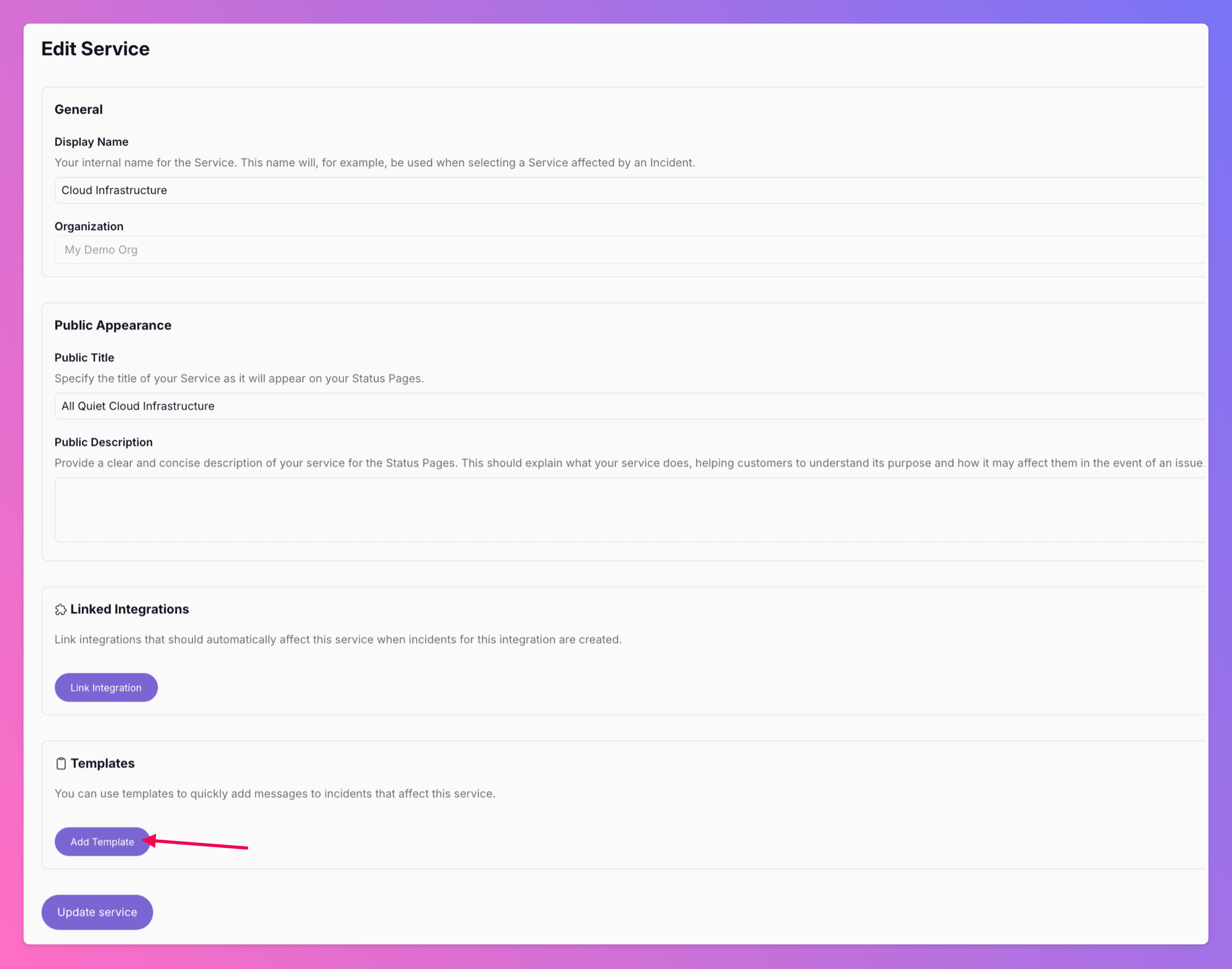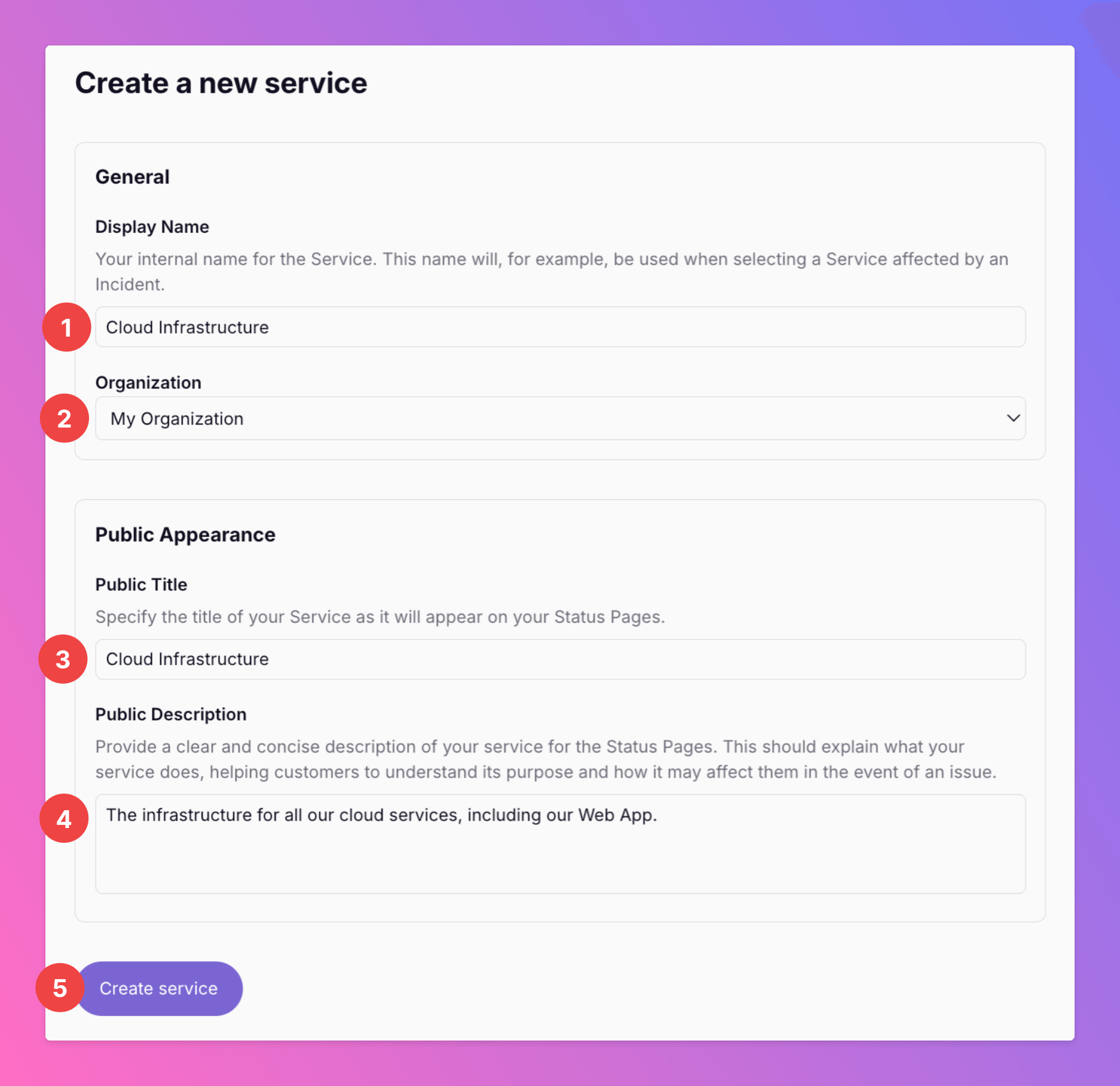of the service. When adding this service to a status page, this name will appear on the status page and in incident update emails to status page subscribers. - Add a