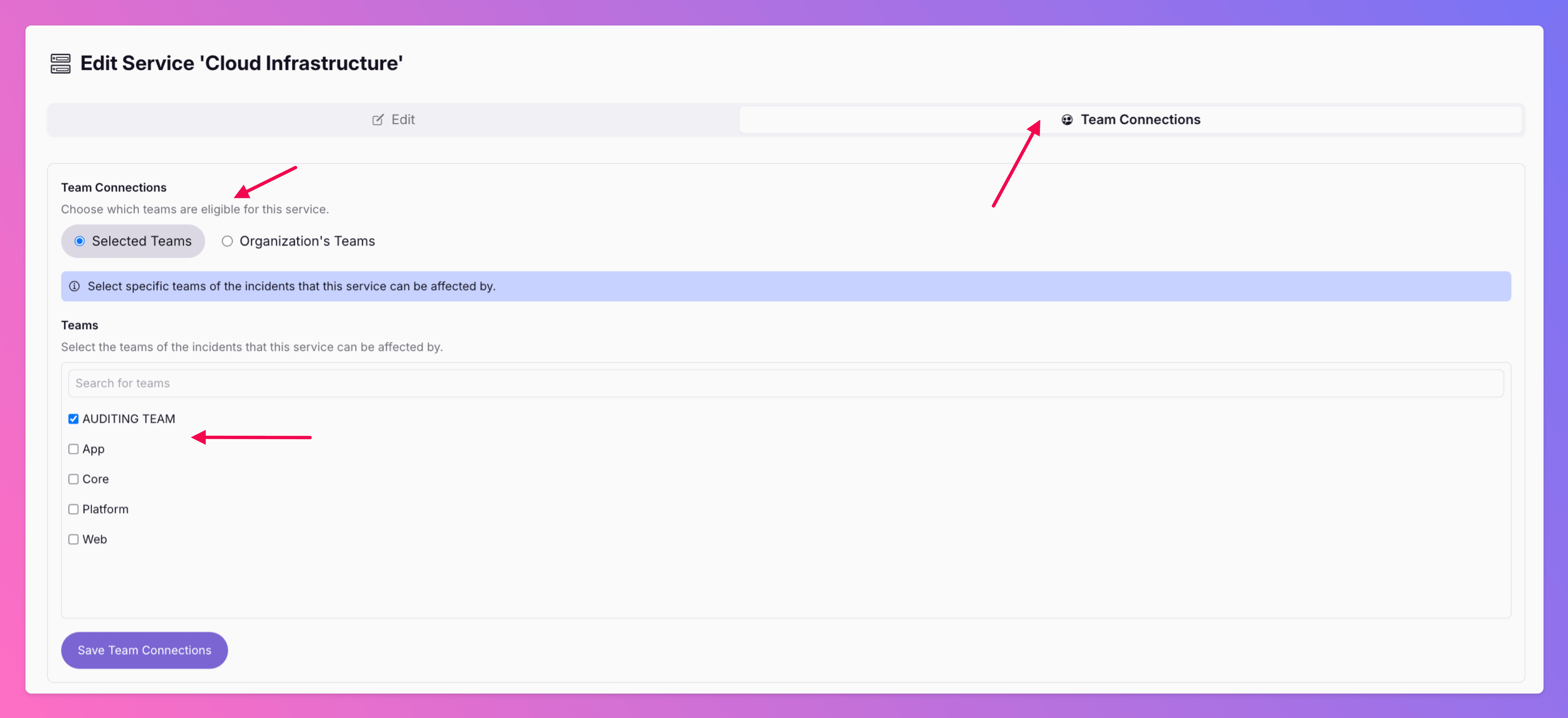 By default, each service is automatically connected to all teams within your organization. You can customize these connections using the Team Connections tab for any selected service. Once configured, future incidents can only affect the service if they are associated with the connected teams.