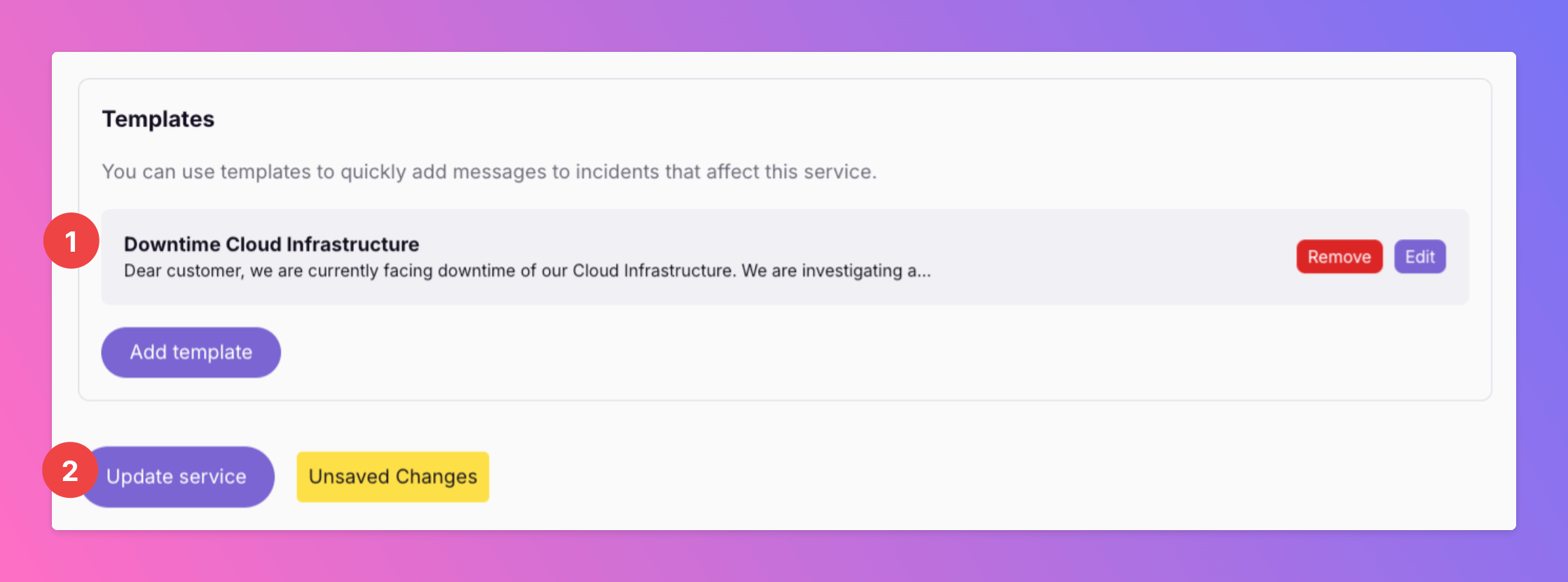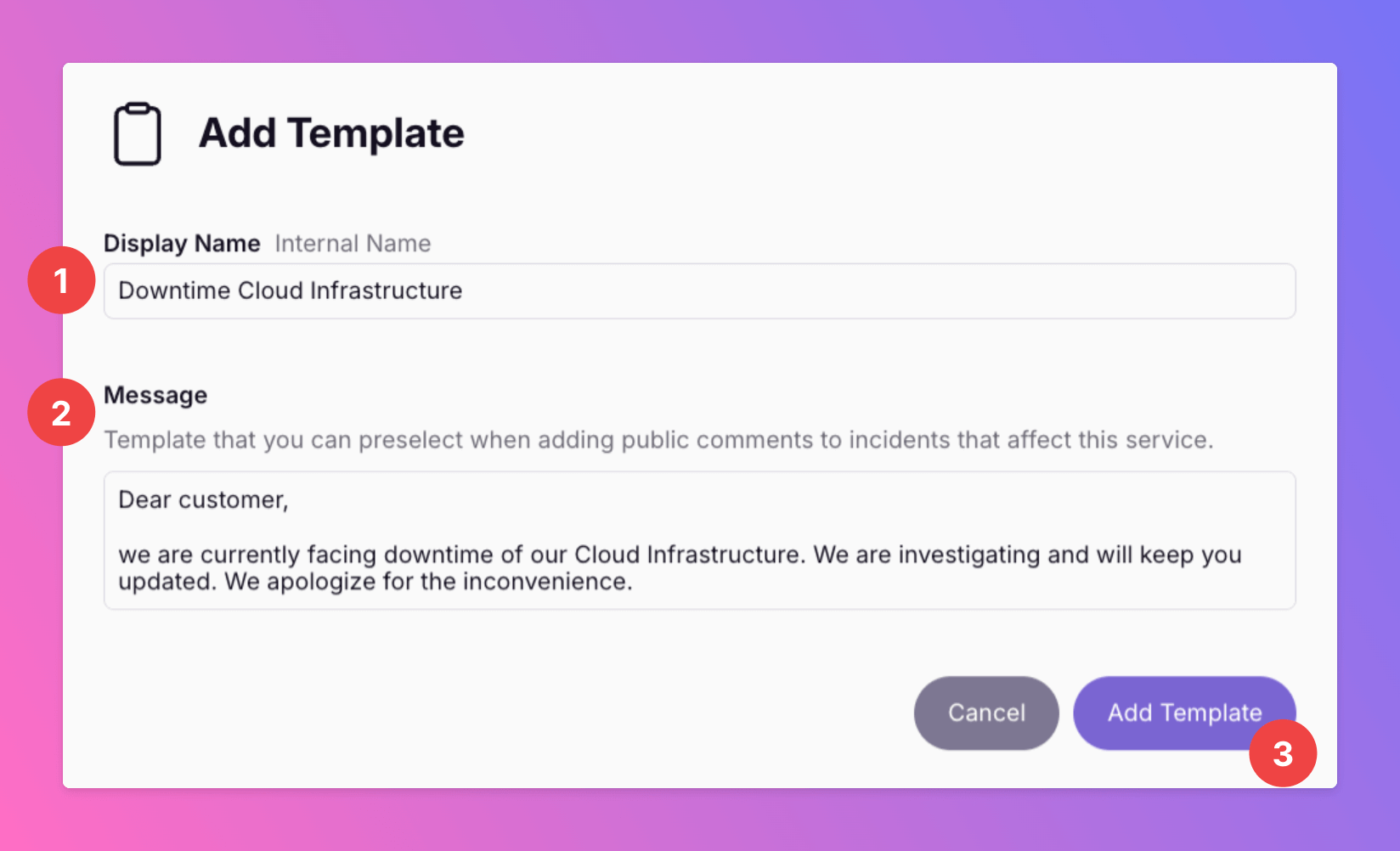 In the case of an incident, status pages offer real-time updates for your customers. To give more context, you might want to add a message if an incident is affecting a service. As every second counts during the incident response, you can create message templates that you can easily copy and paste in the event of an incident. You can find theTemplate