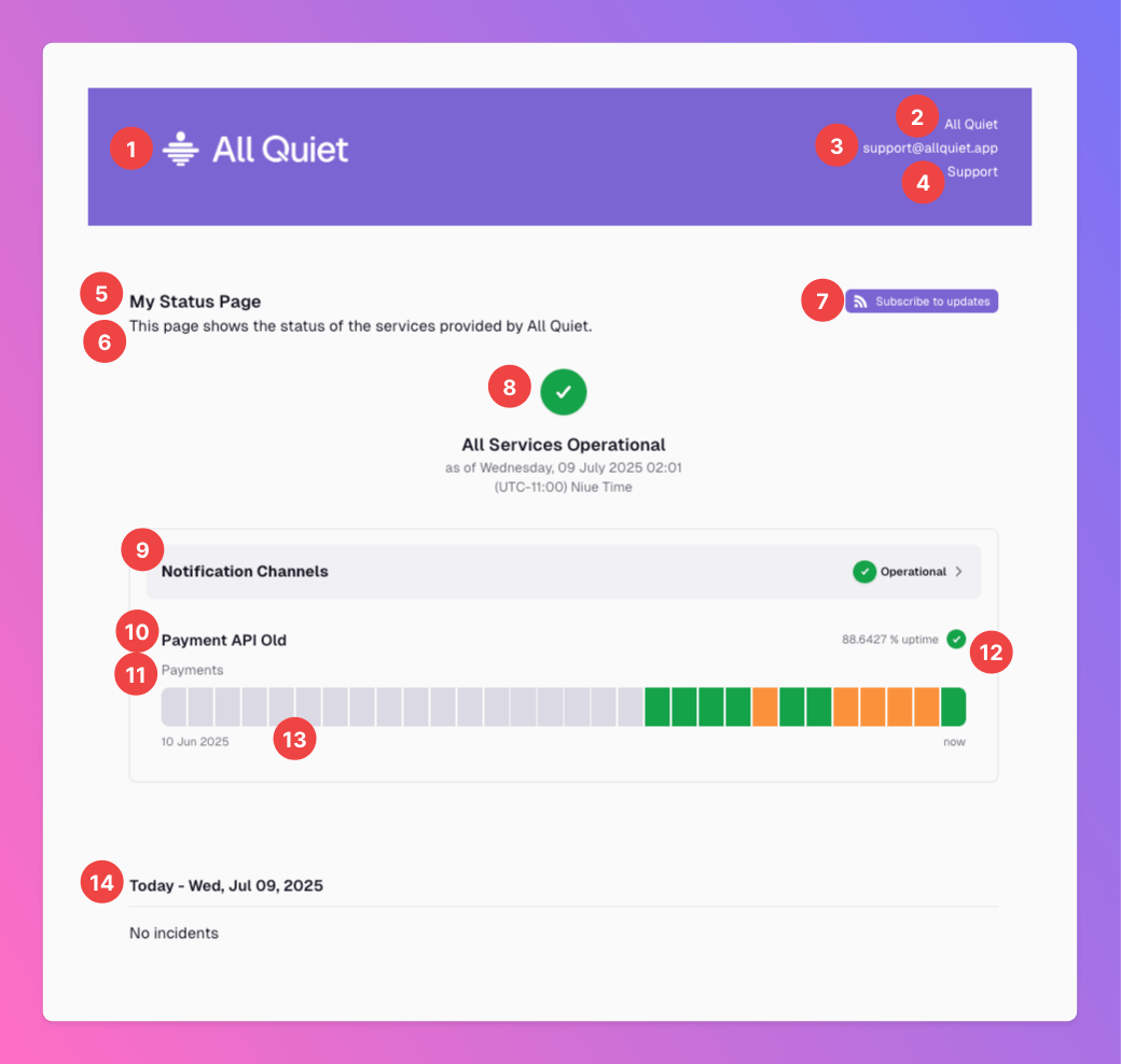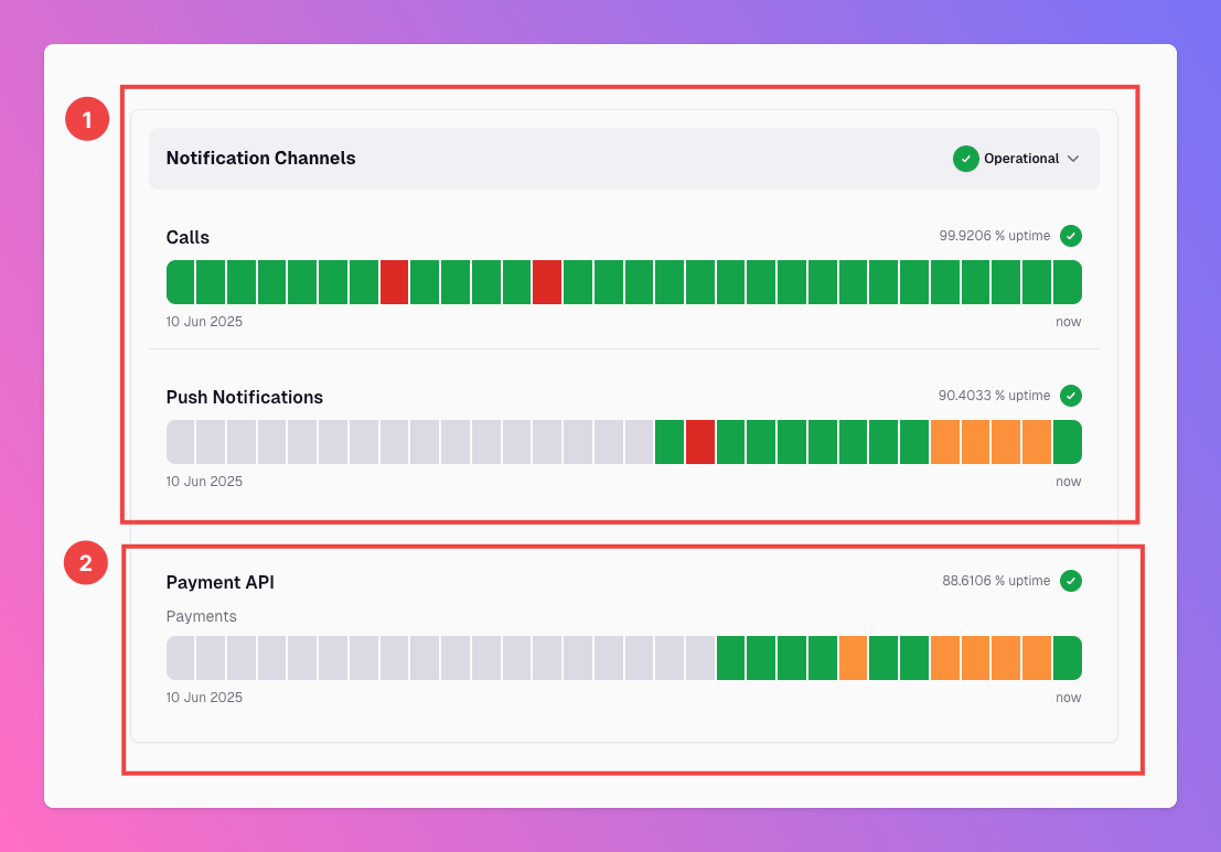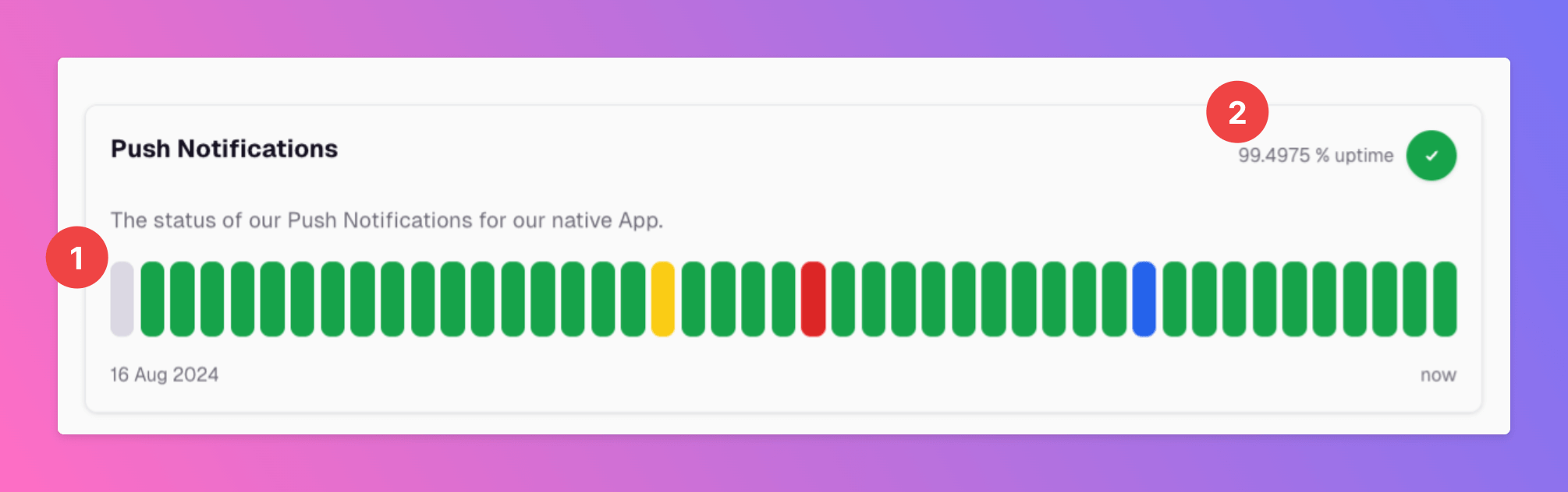 - The historic uptime of the status. If there’s no historic data, the chart elements are coloured grey.