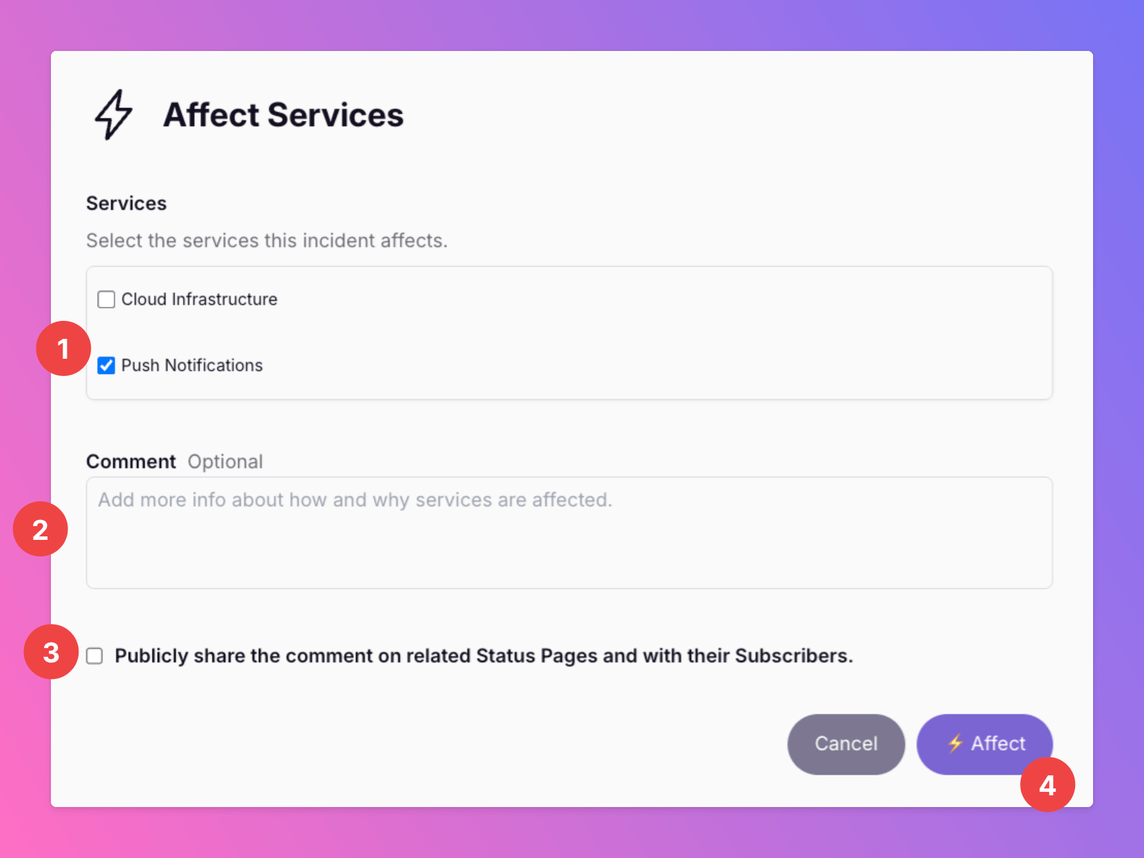 Affects | Yes. Additional public comment is optional. | Incident is added to Status Page, Services are affected. |