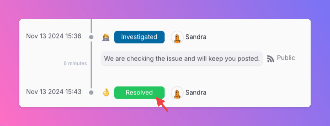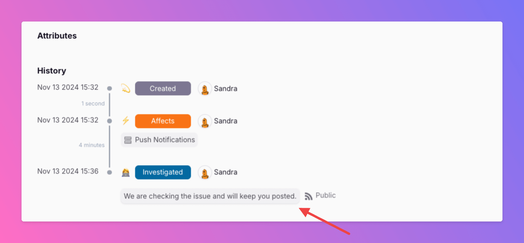 As the team member published the comment, the comment and action are posted in the incident’s history on the status page.