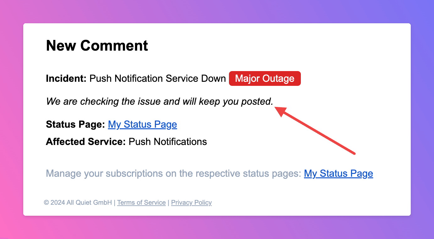 to publish the comment on you status pages and sent it in an email to your subscribers. To create a status page, see below.