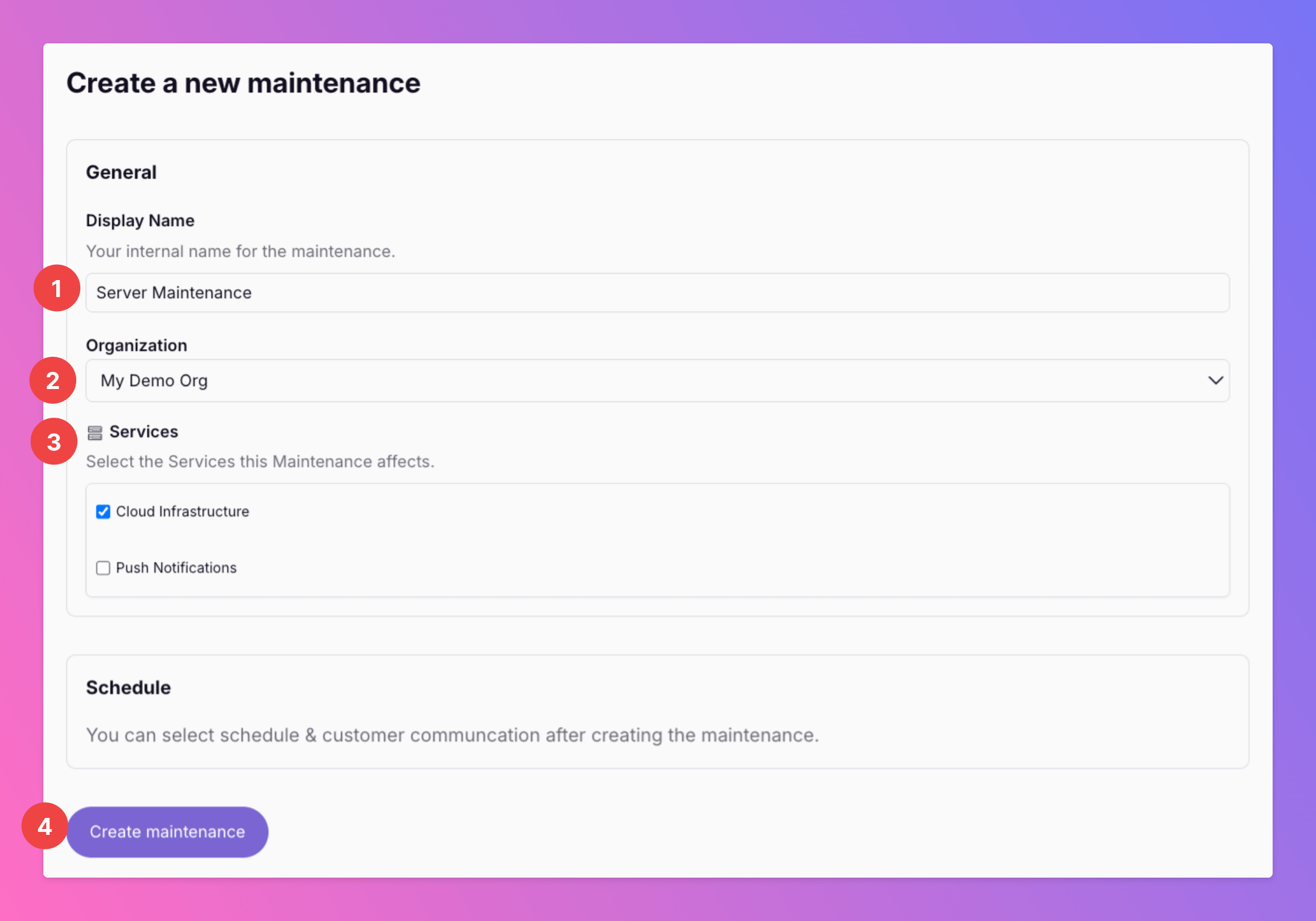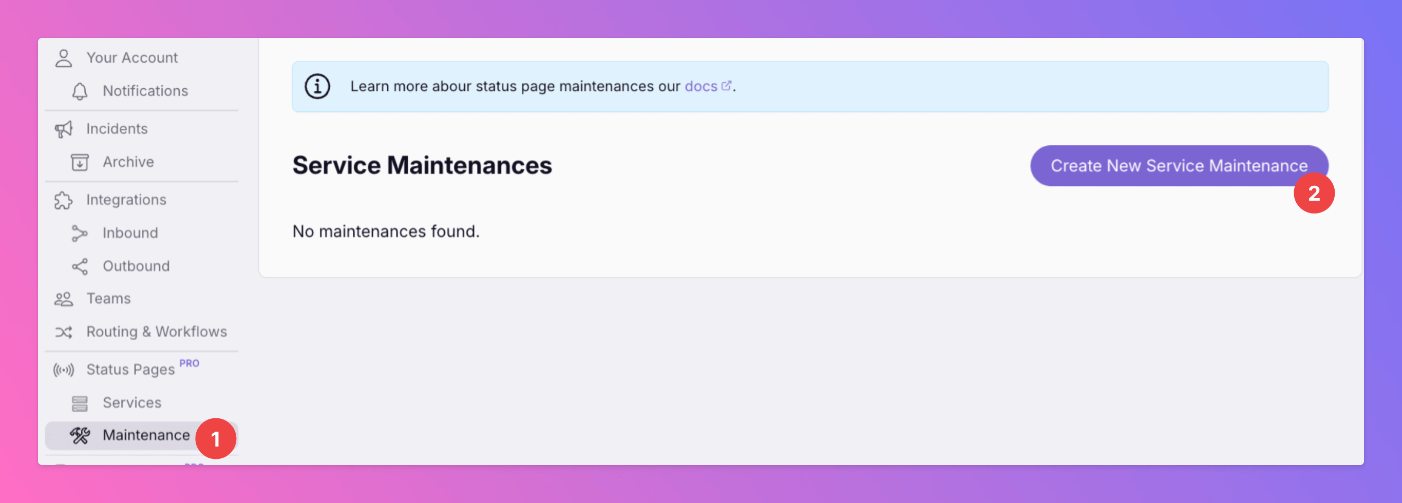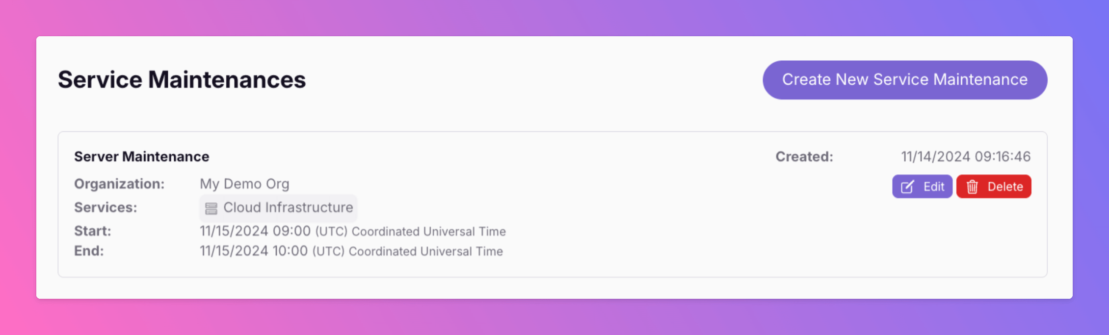 Caution: Don’t delete past maintenances. They will vanish from the status page, and incidents that occured during the deleted maintenance will count as downtime for the affected services