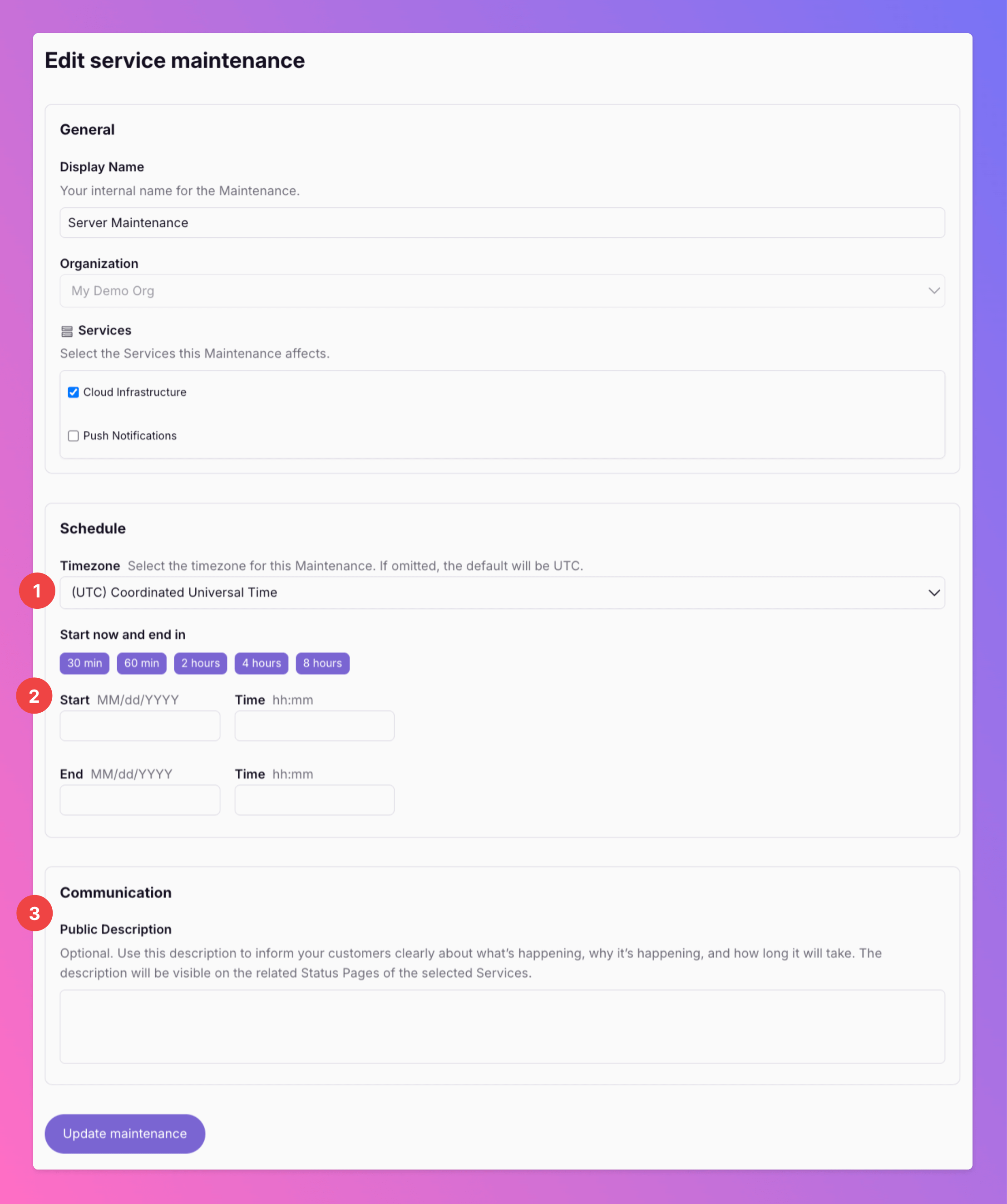 - Select the maintenance’s timezone. If omitted, UTC per default.