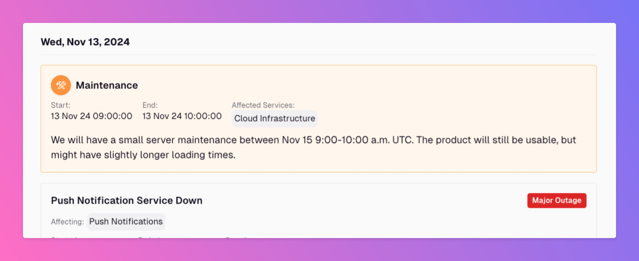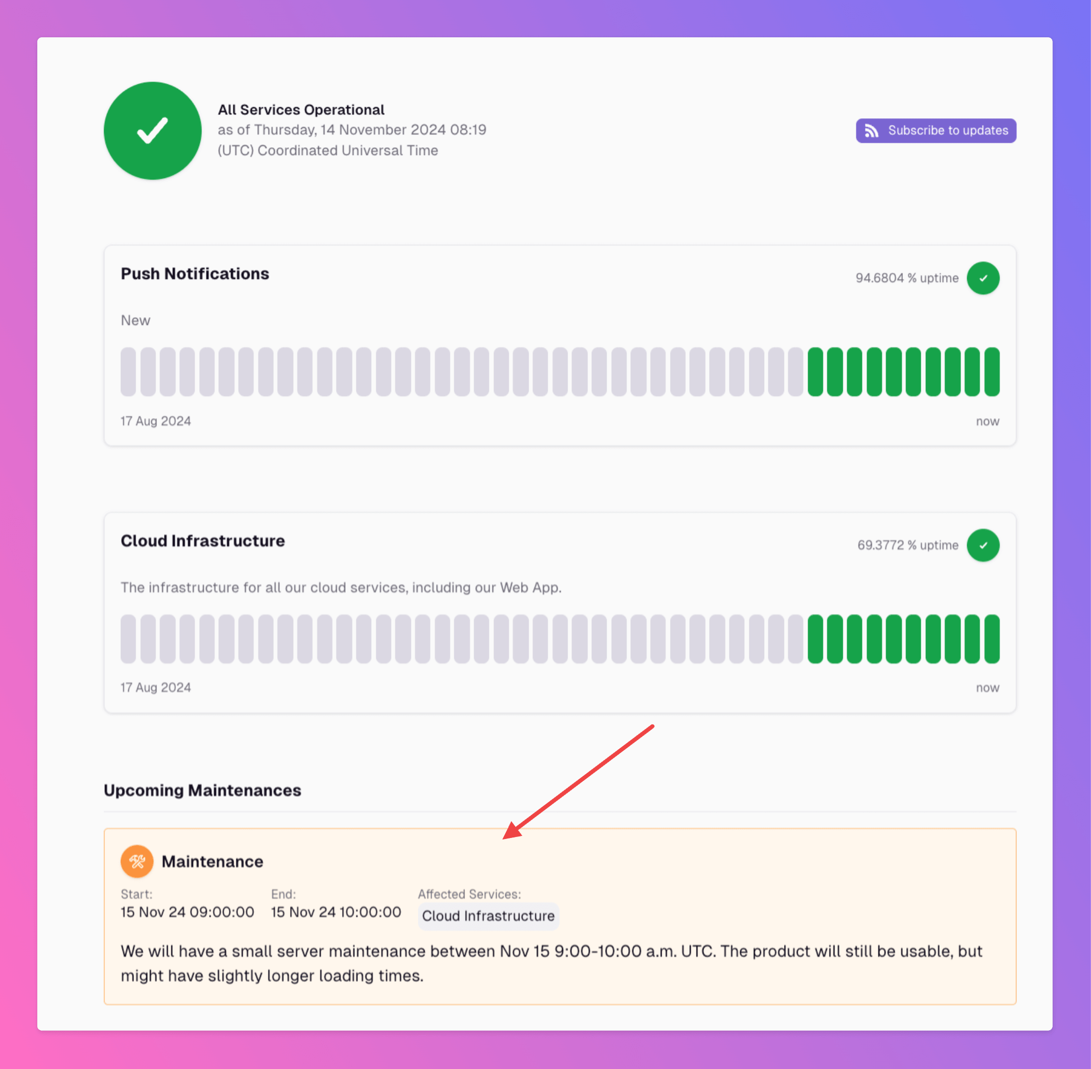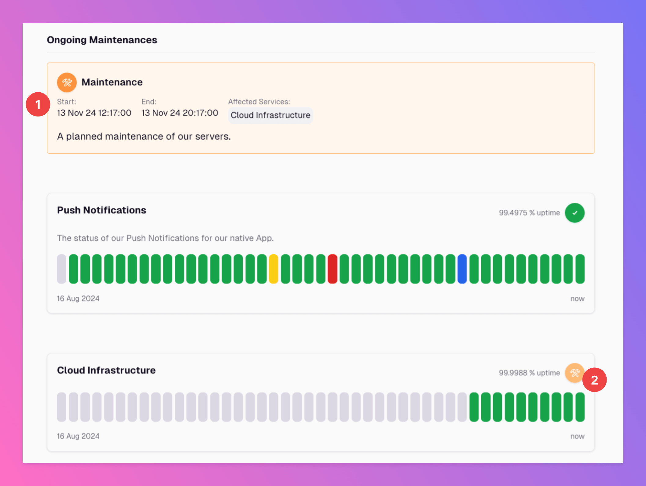 feature for status ages, allowing you to inform customers about plannend maintenances in advance, as well as keeping them in the loop during a maintenance.