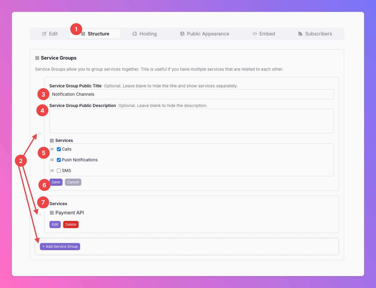 Next, define how your status pages are organized — including how related services are grouped and ordered on the page.- This can be done via the tab