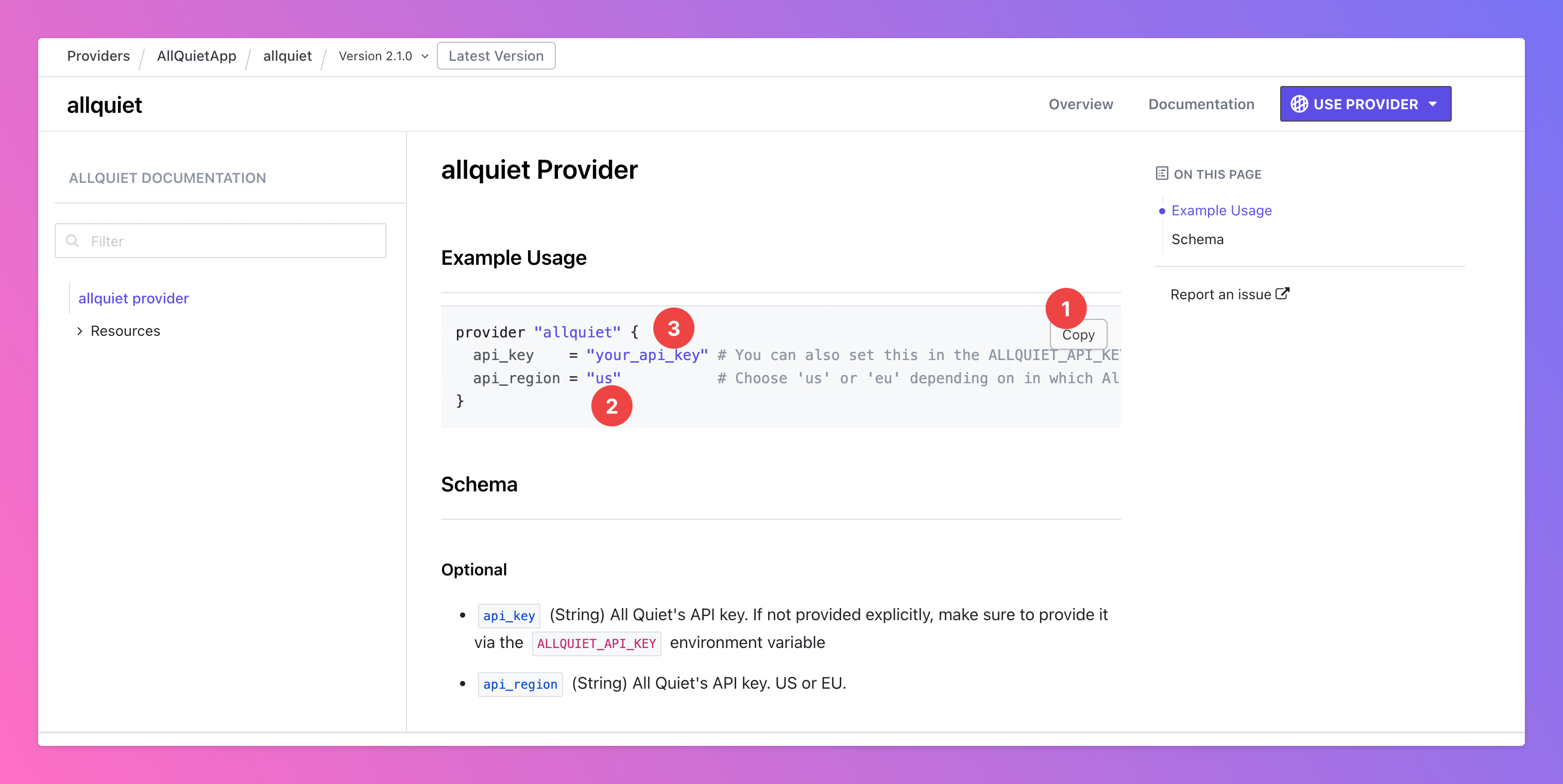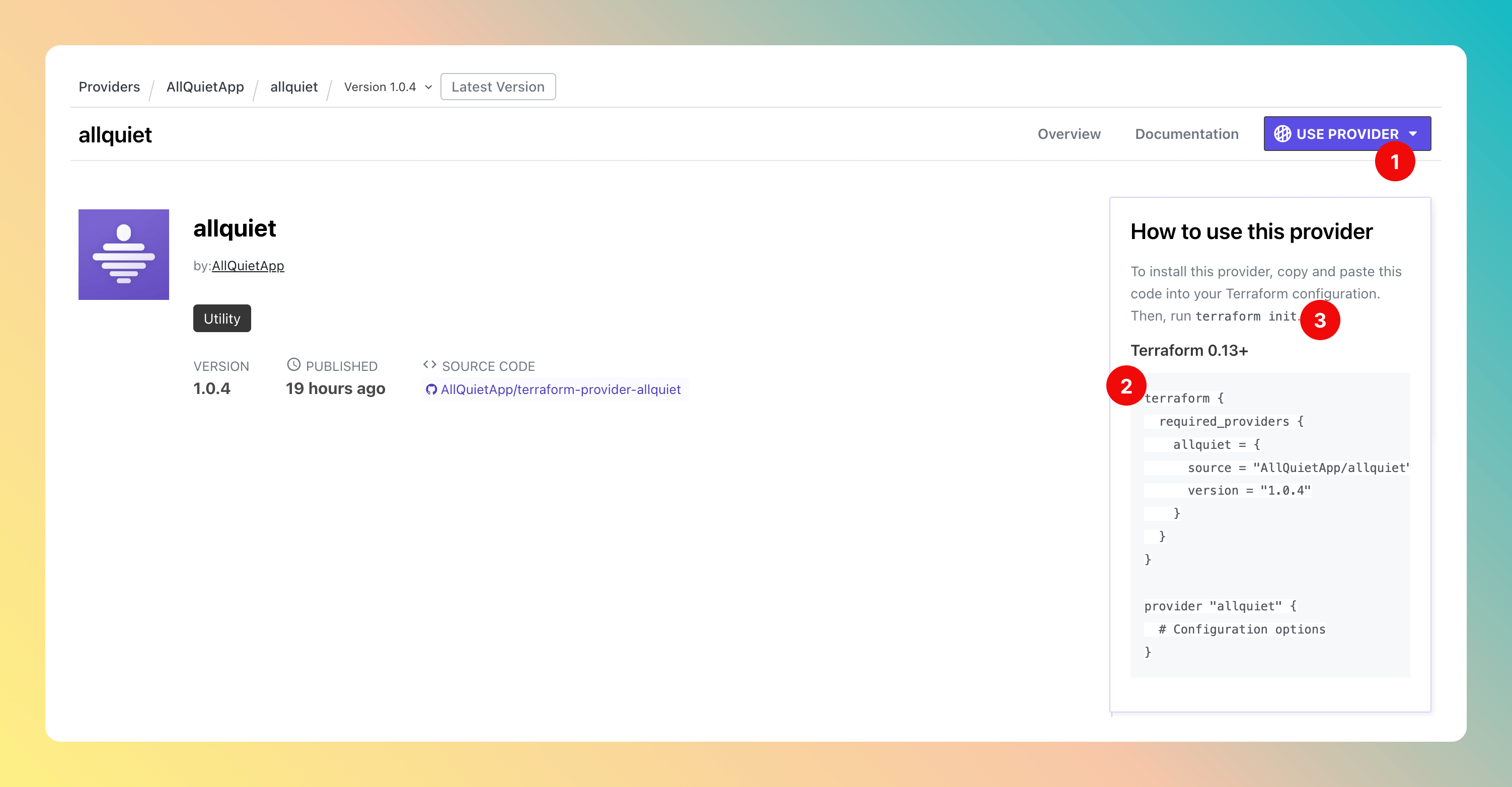 Open the latest version of the All Quiet Terraform Provider.- Click on