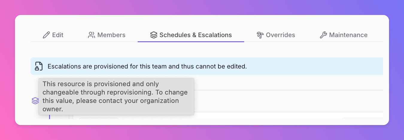 To ensure that the resources managed by your Terraform provider stay in sync with your setup, we lock provisioned resources within the Web App. This means these resources cannot be edited or deleted directly through the Web App’s interface. Provisioned resources are marked with an icon, and hovering over it will display a message explaining why the resource is locked and cannot be modified via the Web App.