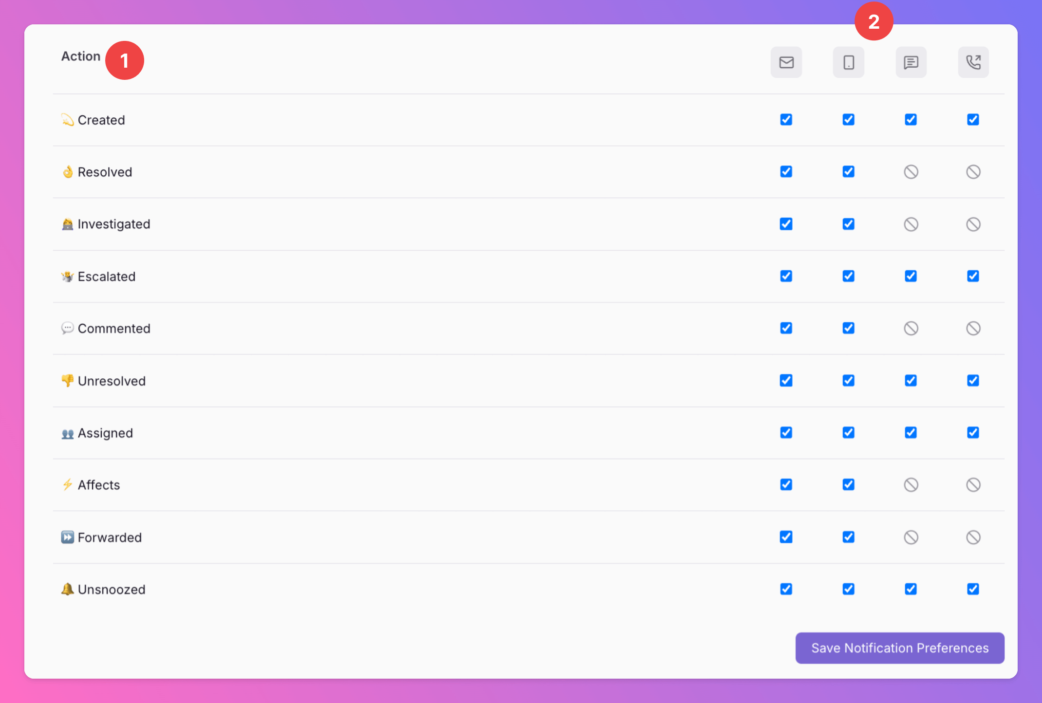 Notification Preferences section, you can customize these settings for each severity (1) and notification channel (2) anytime.