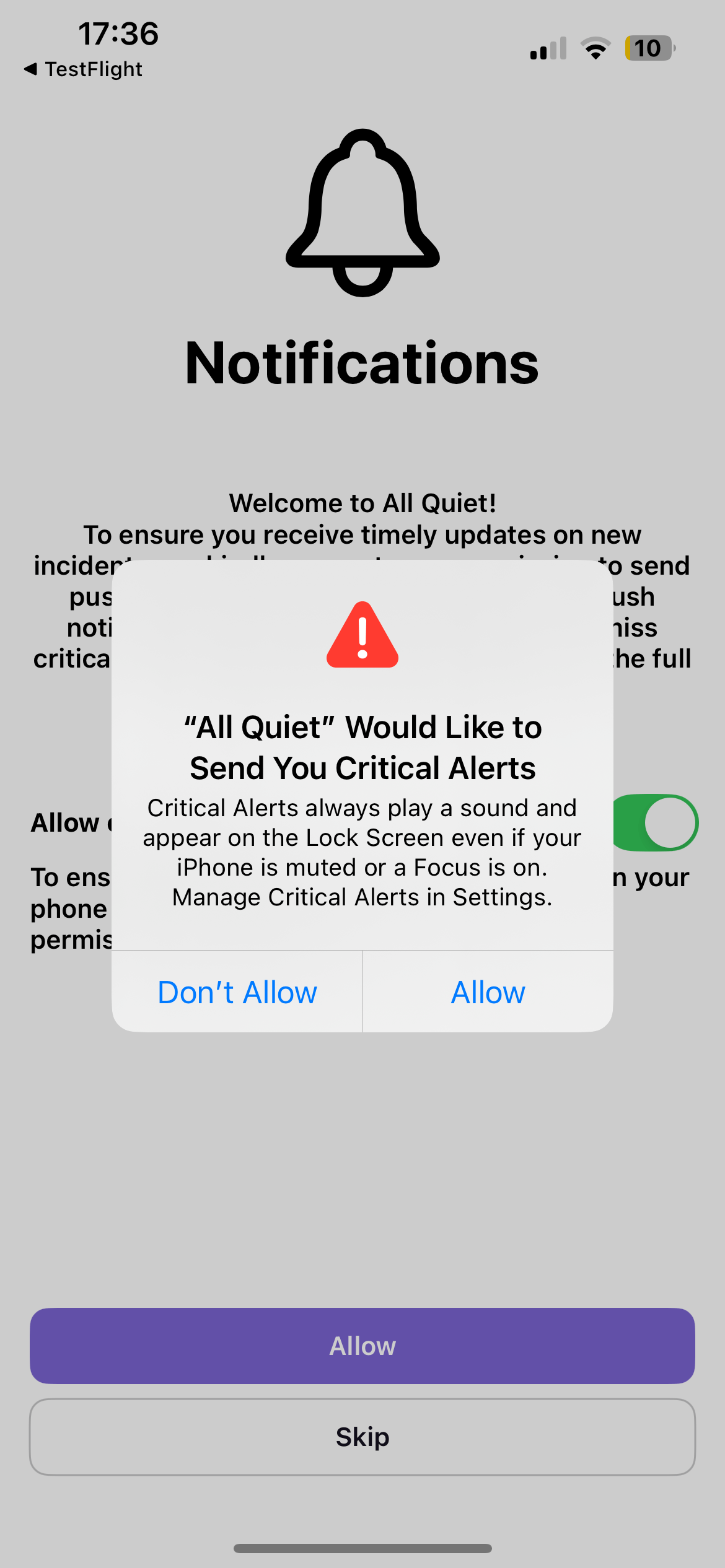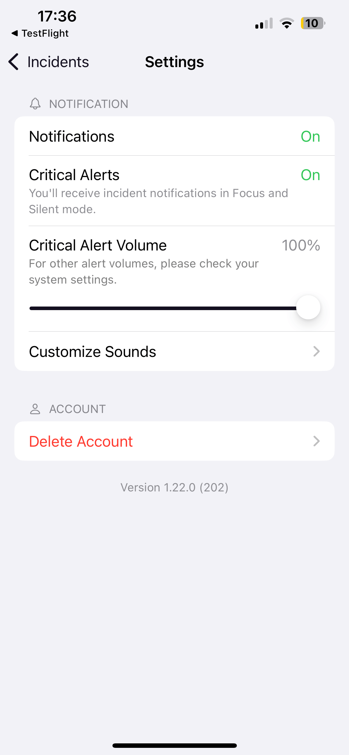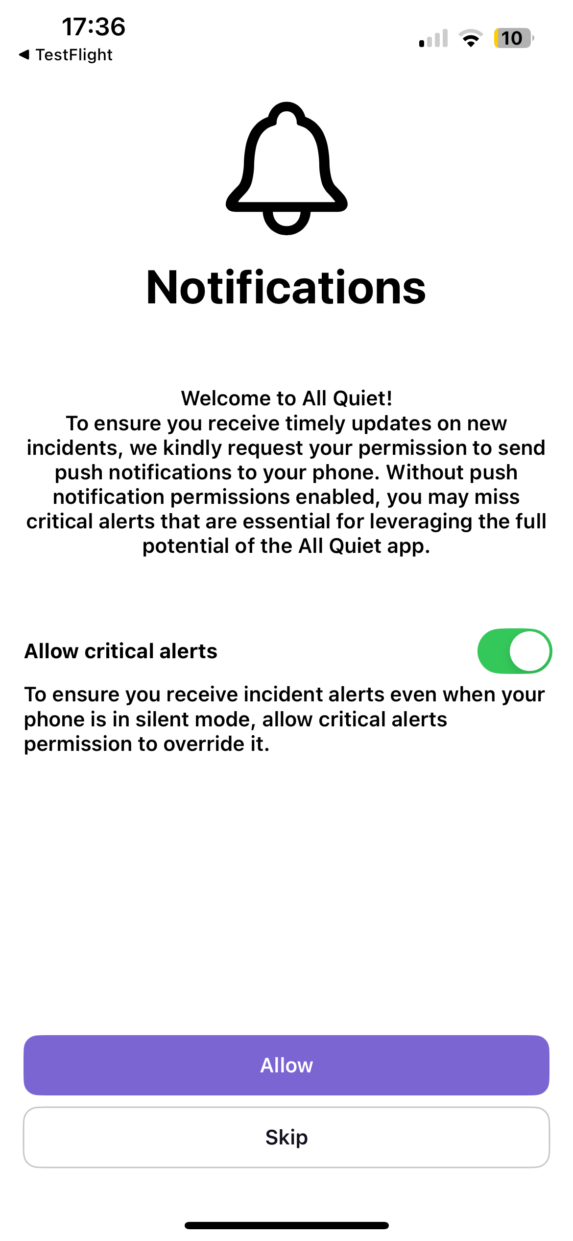 For incidents marked as “Critical,” you can enable “Critical Alerts” in the app. When enabled, these notifications will break through silent and focus modes, ensuring you never miss an urgent alert. You can control this permission in your iOS settings.Critical Alerts will only be triggered when the incident’s severity is