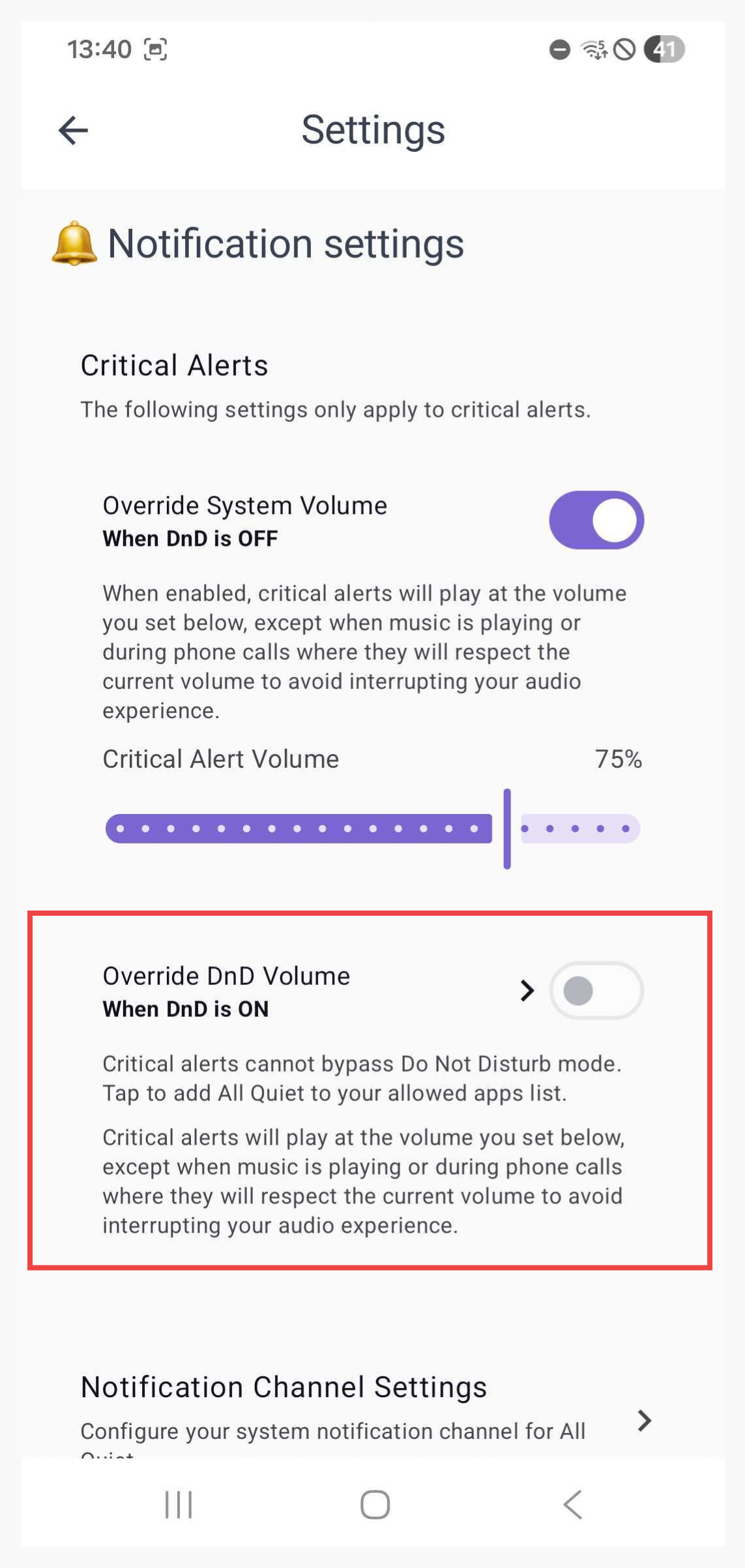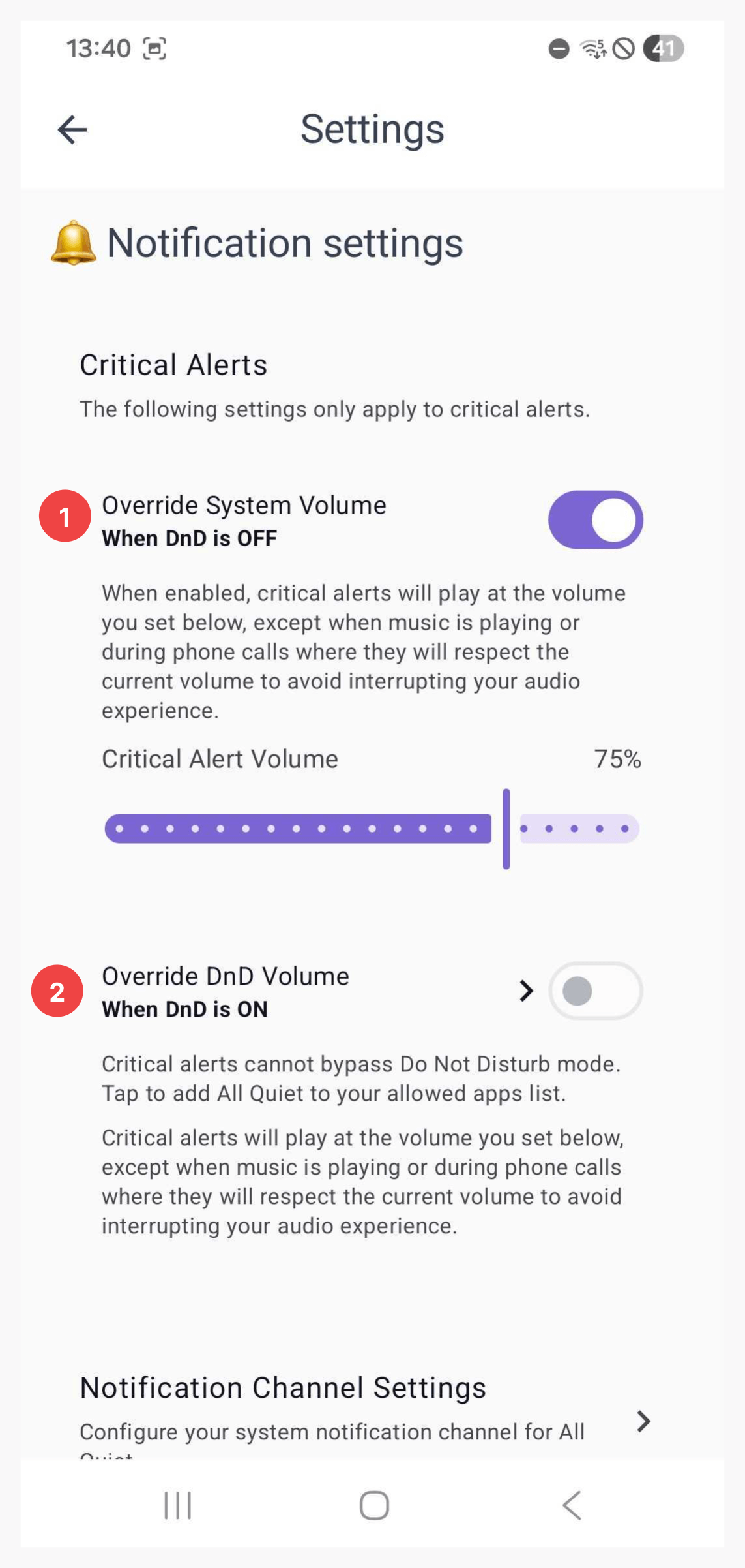 - Override System Volume (When DnD is off): When notifications are allowed, enabled by default. When this is on, critical alerts will play a sound even if your phone is in silent mode (but not in DnD). You can set a custom volume for these alerts in your notification settings. When receiving a notification while playing media or in a call, we adapt this volume to the media / the voice call volume.