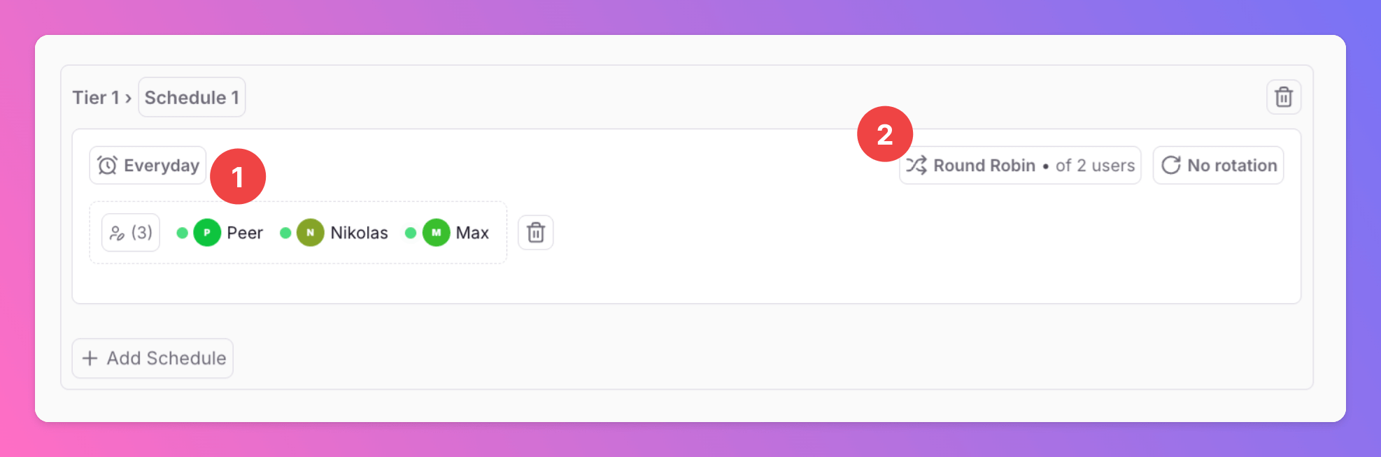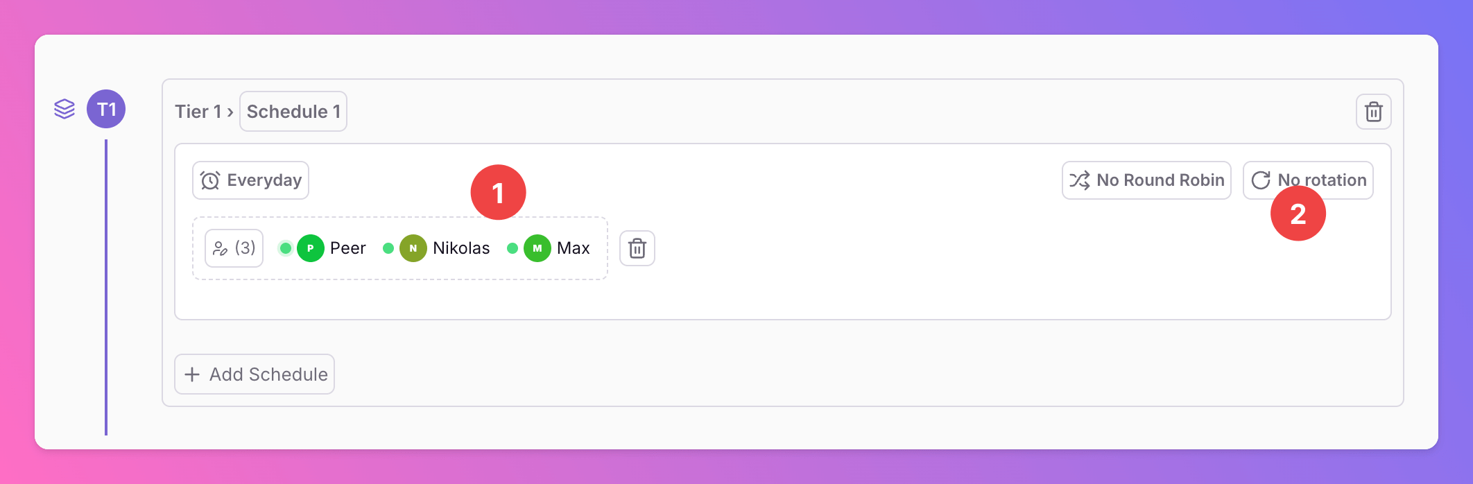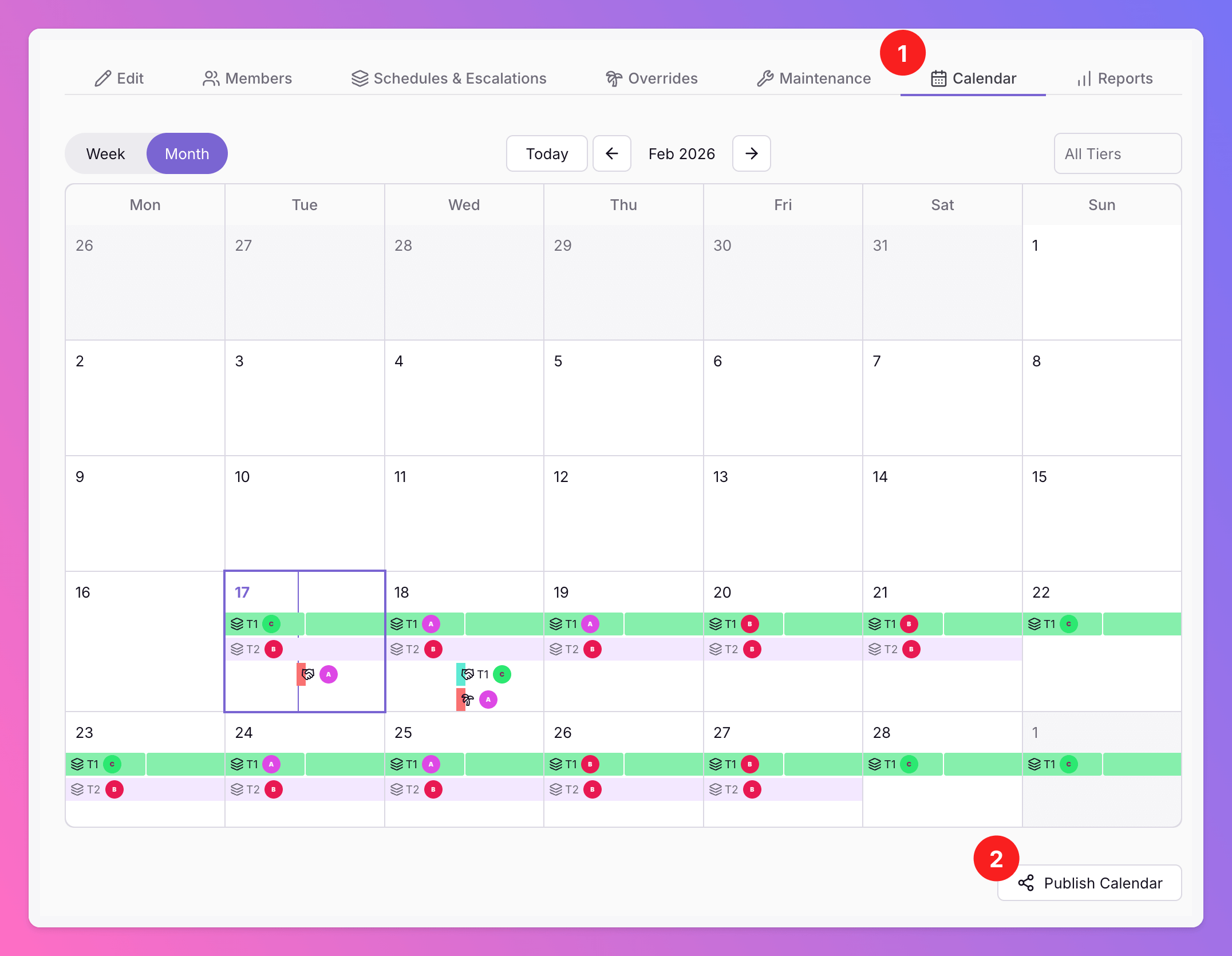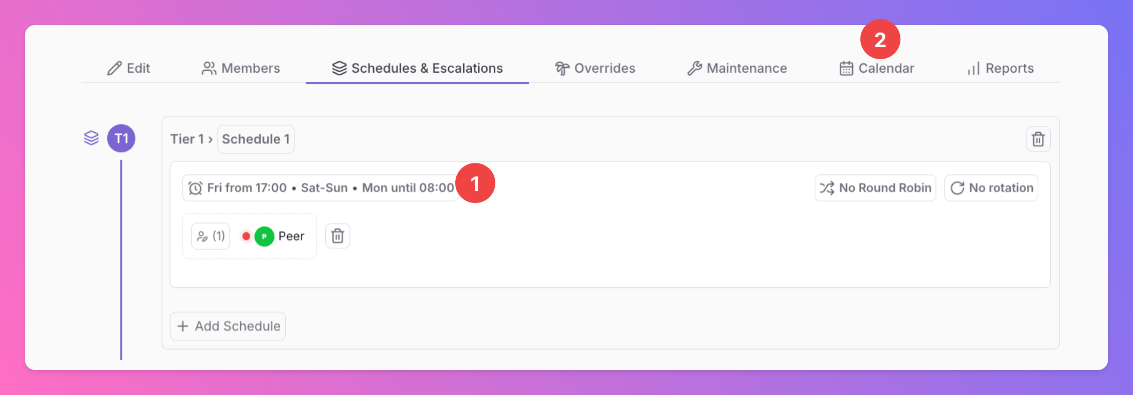 - On-Call Now Indicators: These indicators provide a quick view of which team members are currently on-call. The indicators are color-coded and numbered to correspond with the tier of on-call duty.