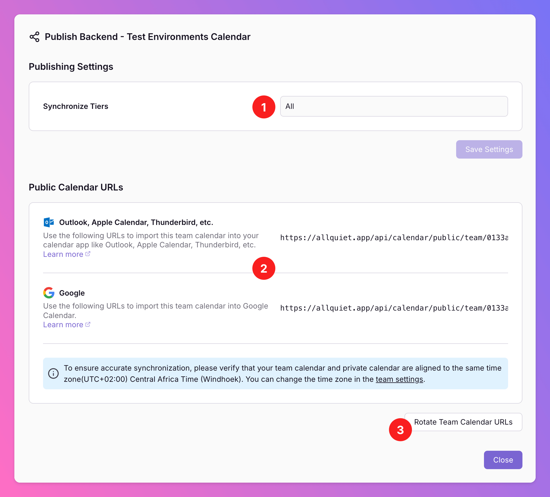 Publish Team Calendar URLs, you will see your team’s specific URLs that you can use to subcribe to the All Quiet On-Call calendar from your private calendar. Simply click on the URLs to copy them. - If you click “Rotate Team Calendar URL”, a new calendar link will be generated. Any subscriptions using the old link will stop updating, so you’ll need to resubscribe with the new URL.