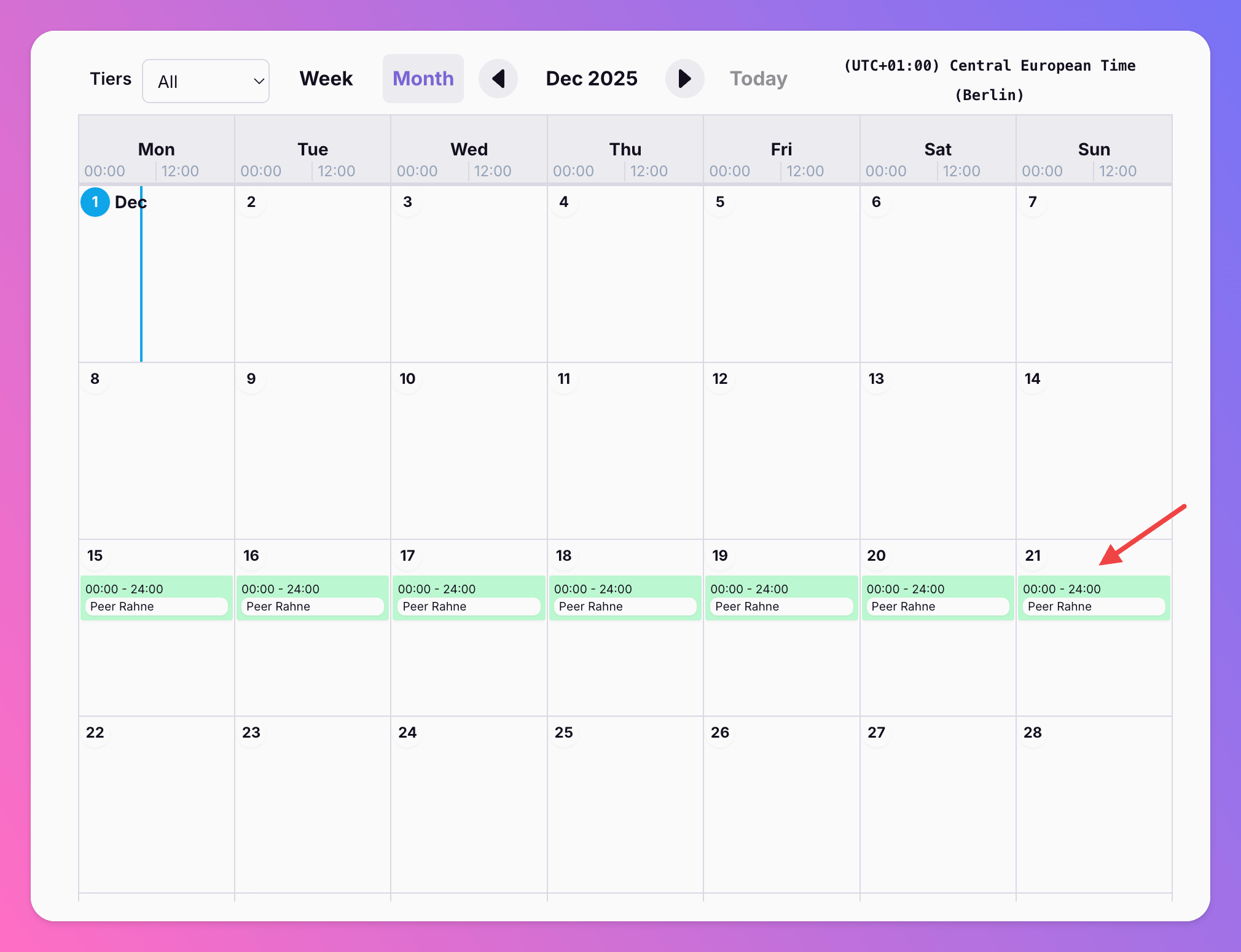 To create an individual override, such as a “fill-in” for a colleague on vacation or for your own vacation, you can add overrides with specified start and end dates. Simply click the “Add personal Override” button in the “Your Availability” section of the web app.- A calendar will appear, allowing you to select the start date and end date.