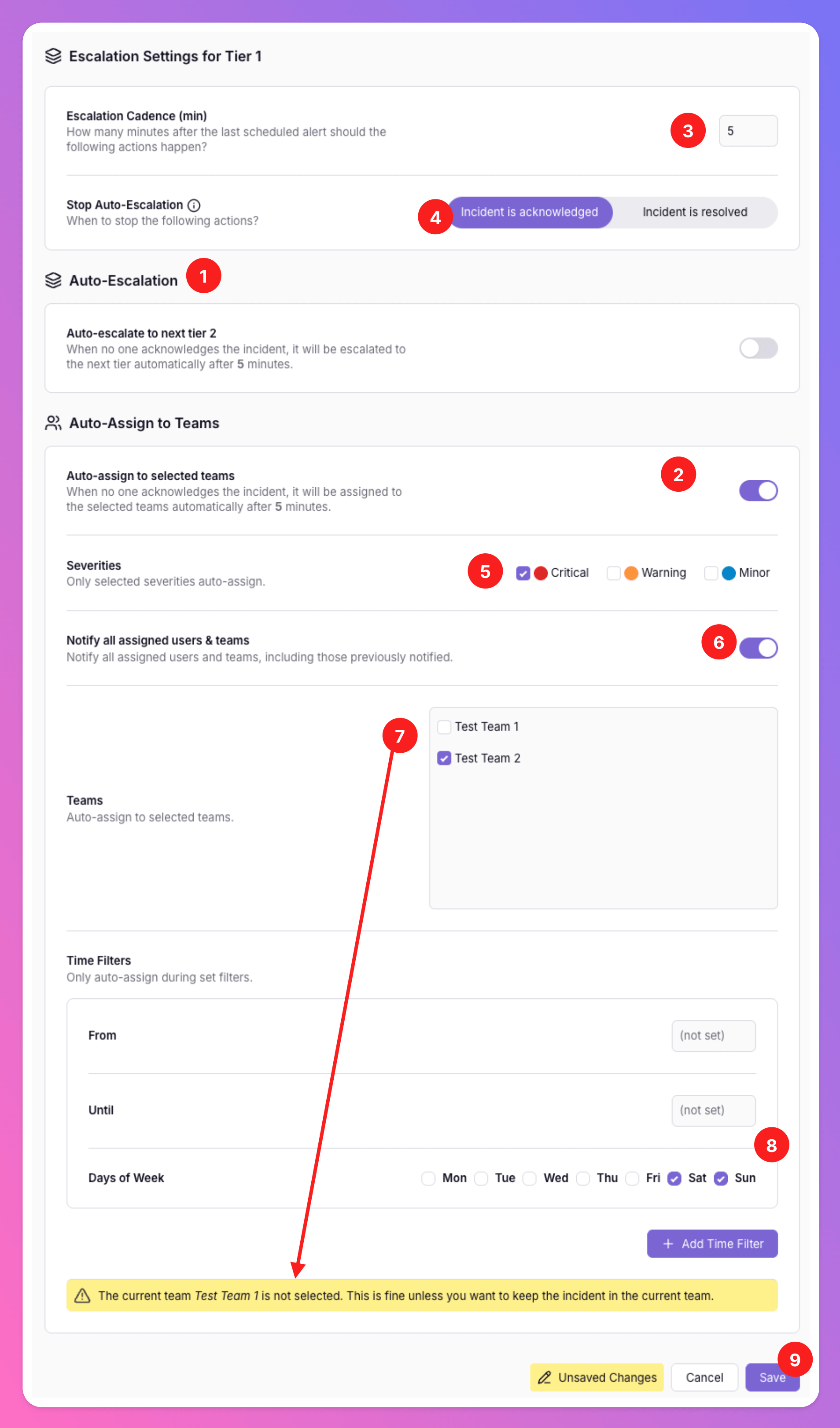 - Team B: Auto-escalates to Tier 2, 2 minutes after Tier 1 was notified (t=4min)