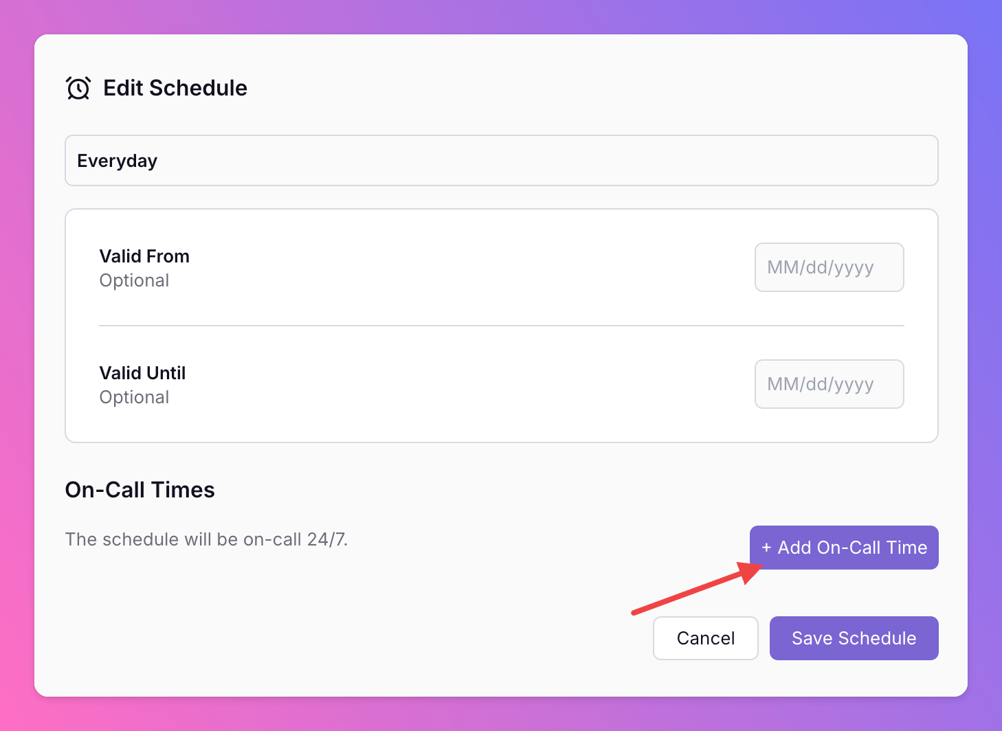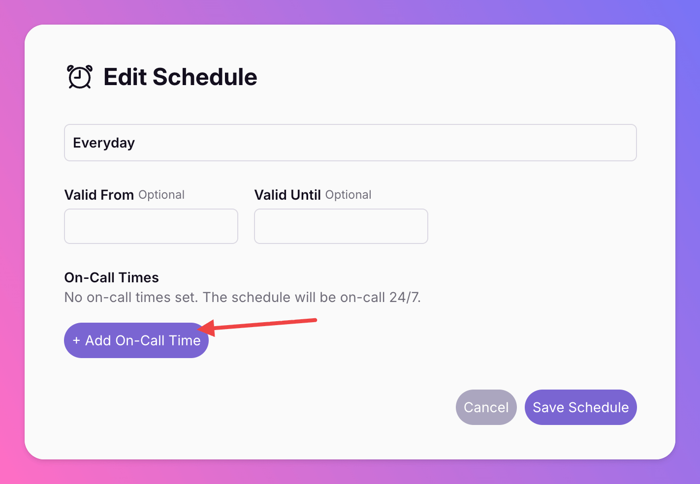 For now, we will focus on the On-Call Times. You can add as many on-call times as you like for one specific schedule. To start, click + Add On-Call Time. A schedules default on-call time is 24/7.