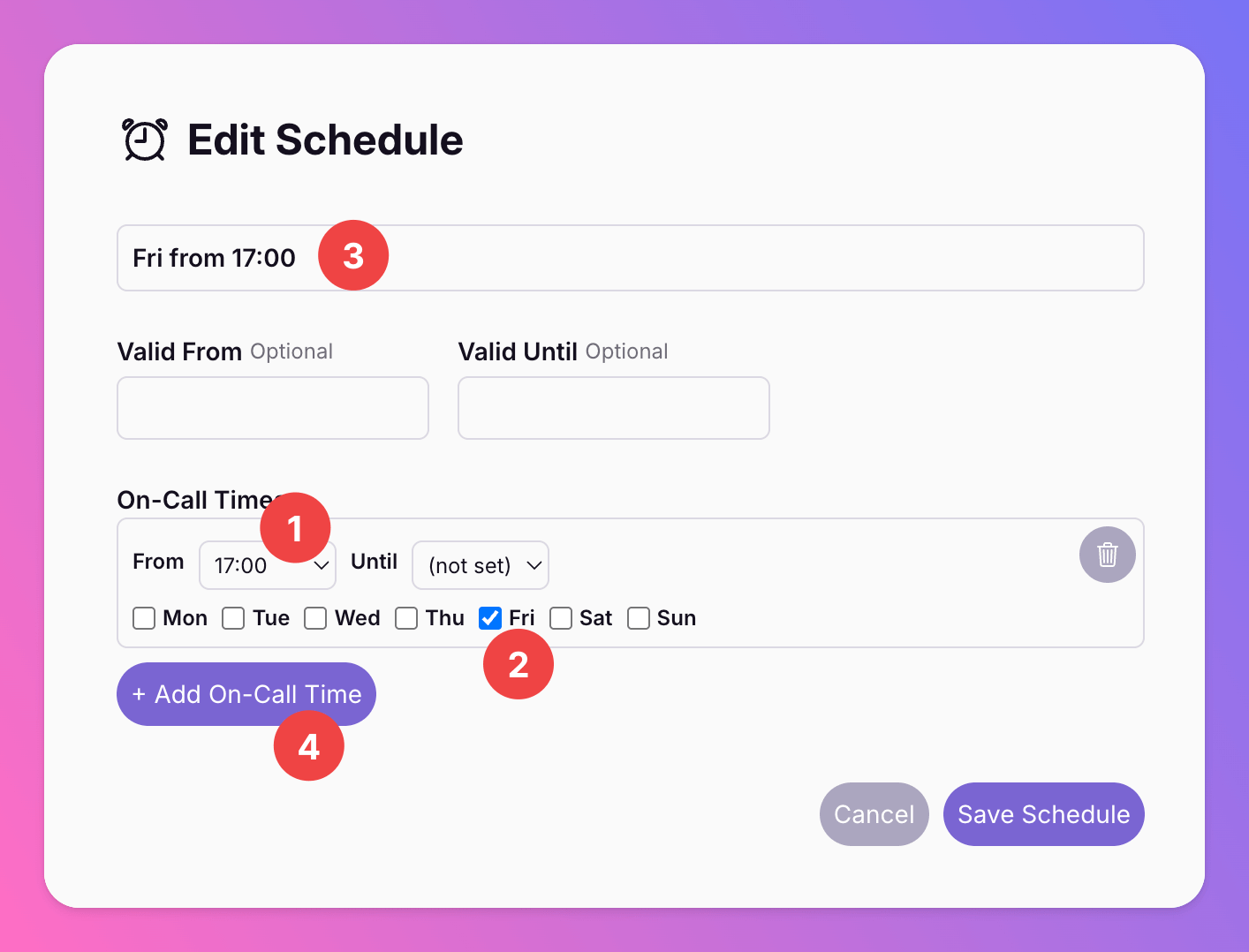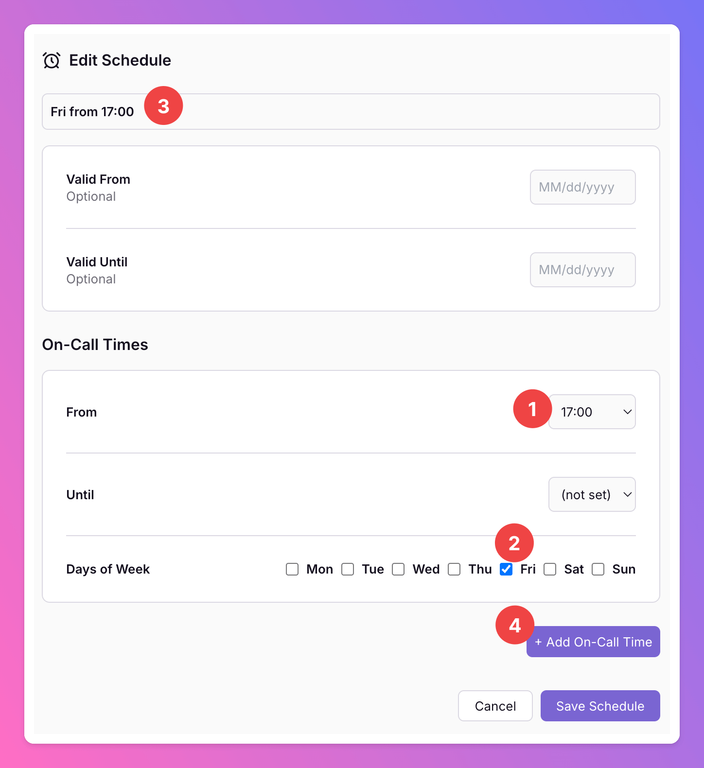 - Additionally, we select the weekdays when the members of the schedule should be on-call from 17:00 - end of the day by checking the corresponding checkbox for Friday.