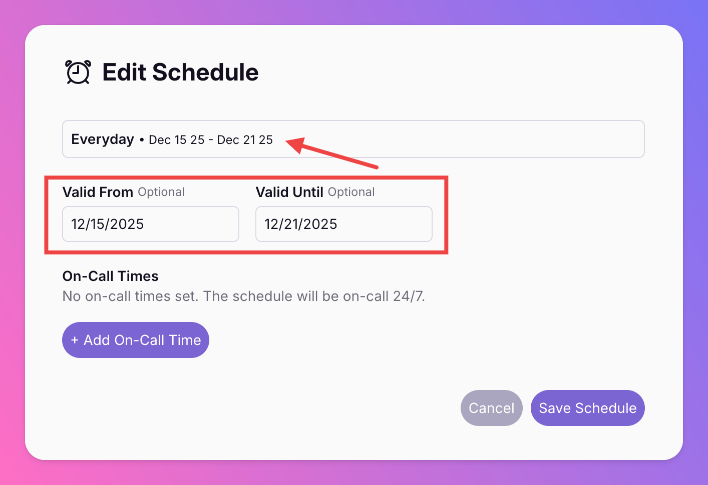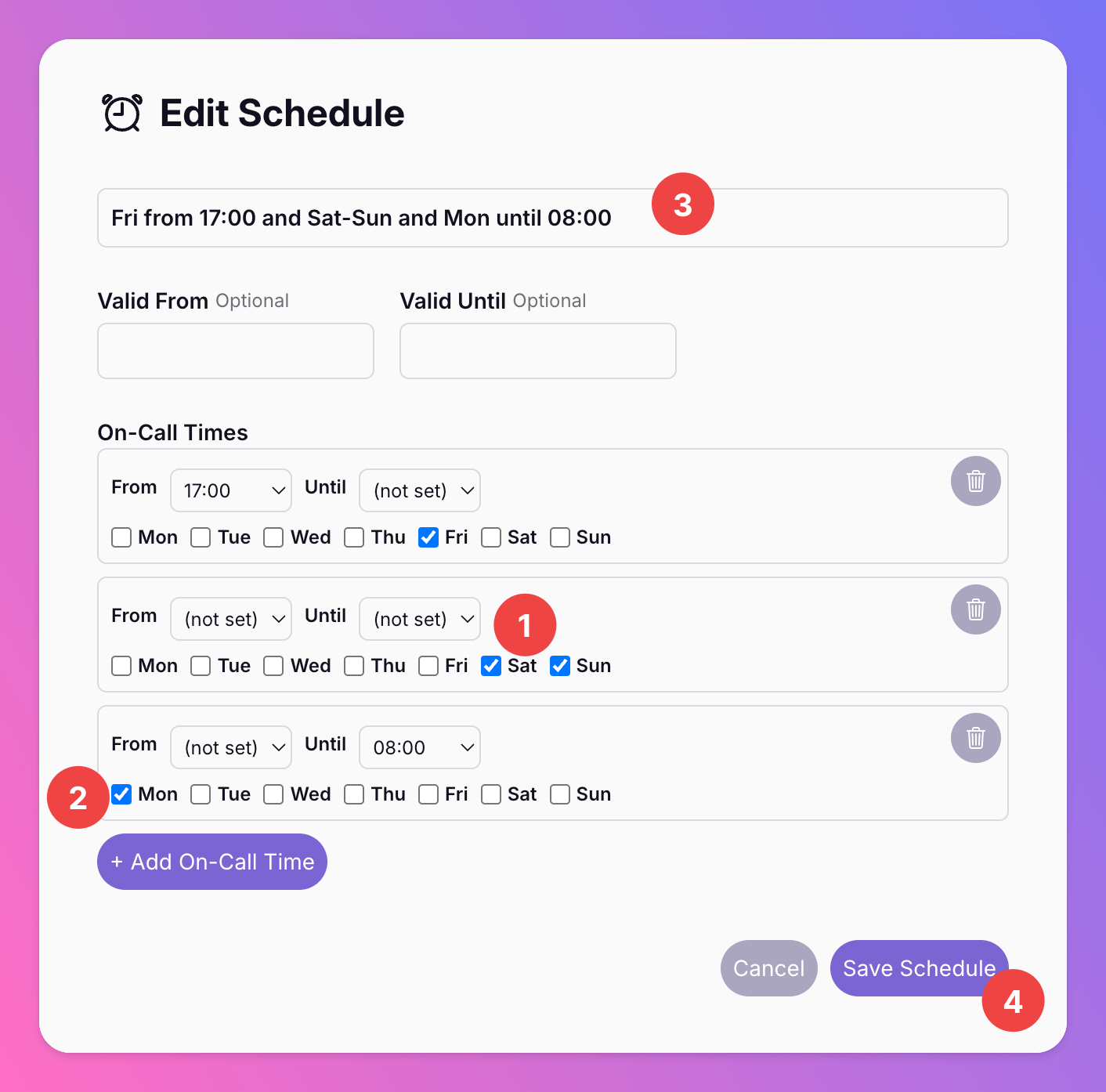 - After saving, you will immediately see the current schedule’s settings displayed in natural language format at the top left corner. This provides a clear and easily understandable representation of the saved schedule settings, ensuring visibility and quick reference to the configured on-call periods and weekdays.