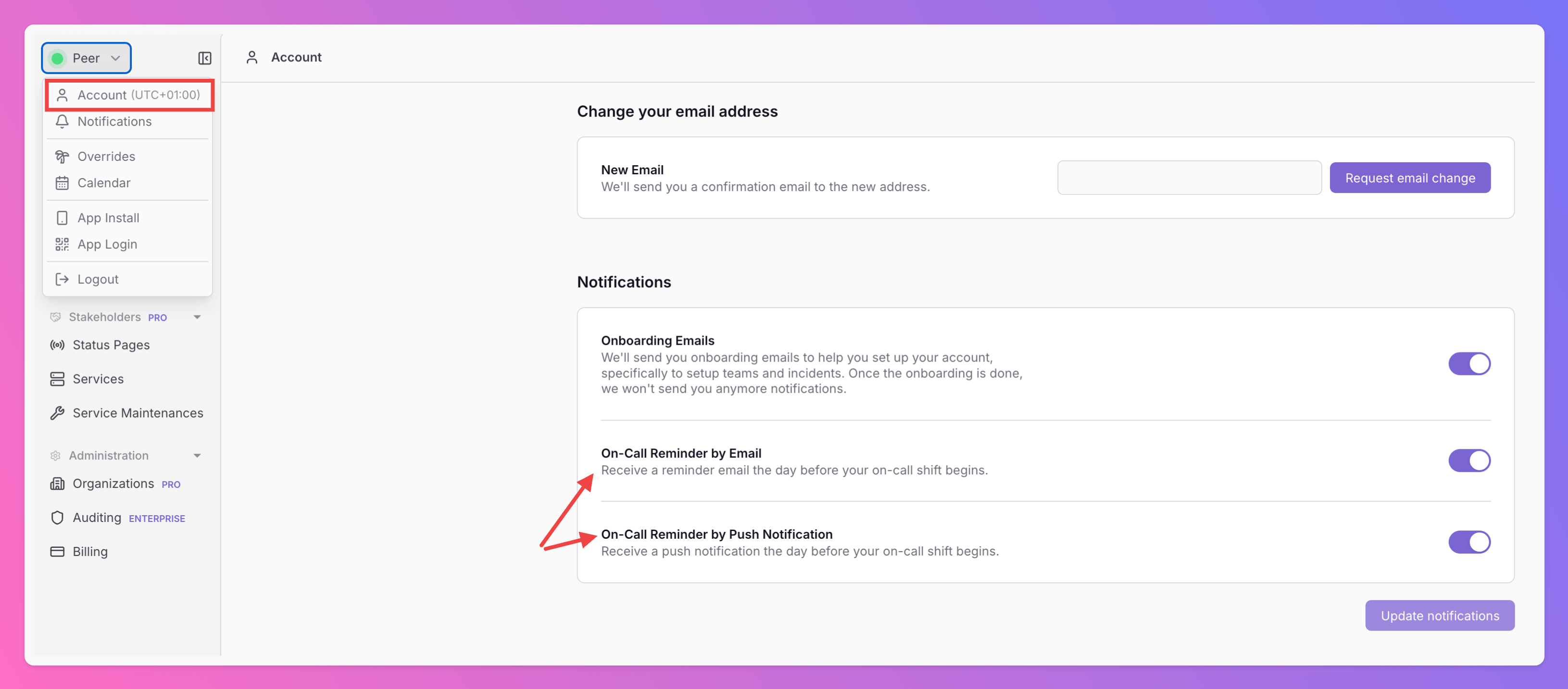 Stay informed with our automatic on-call reminders. By default, you’ll get an email one day prior to your shift to help you prepare. Prefer not to be reminded? No problem. Just deselect the reminder in your account settings.