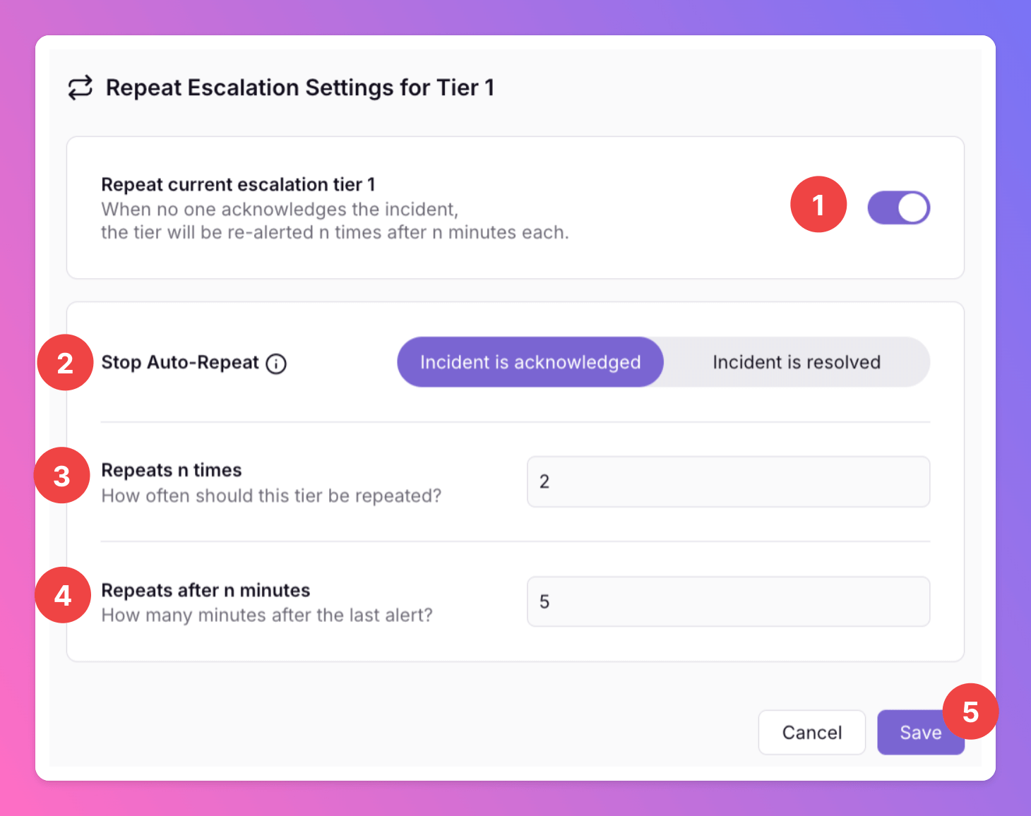 Repeat current escalation tier, activate the toggle. - Decide when auto-repeat should stop, whether it’s after someone acknowledges the incident or whether auto-repeats should happen until someone