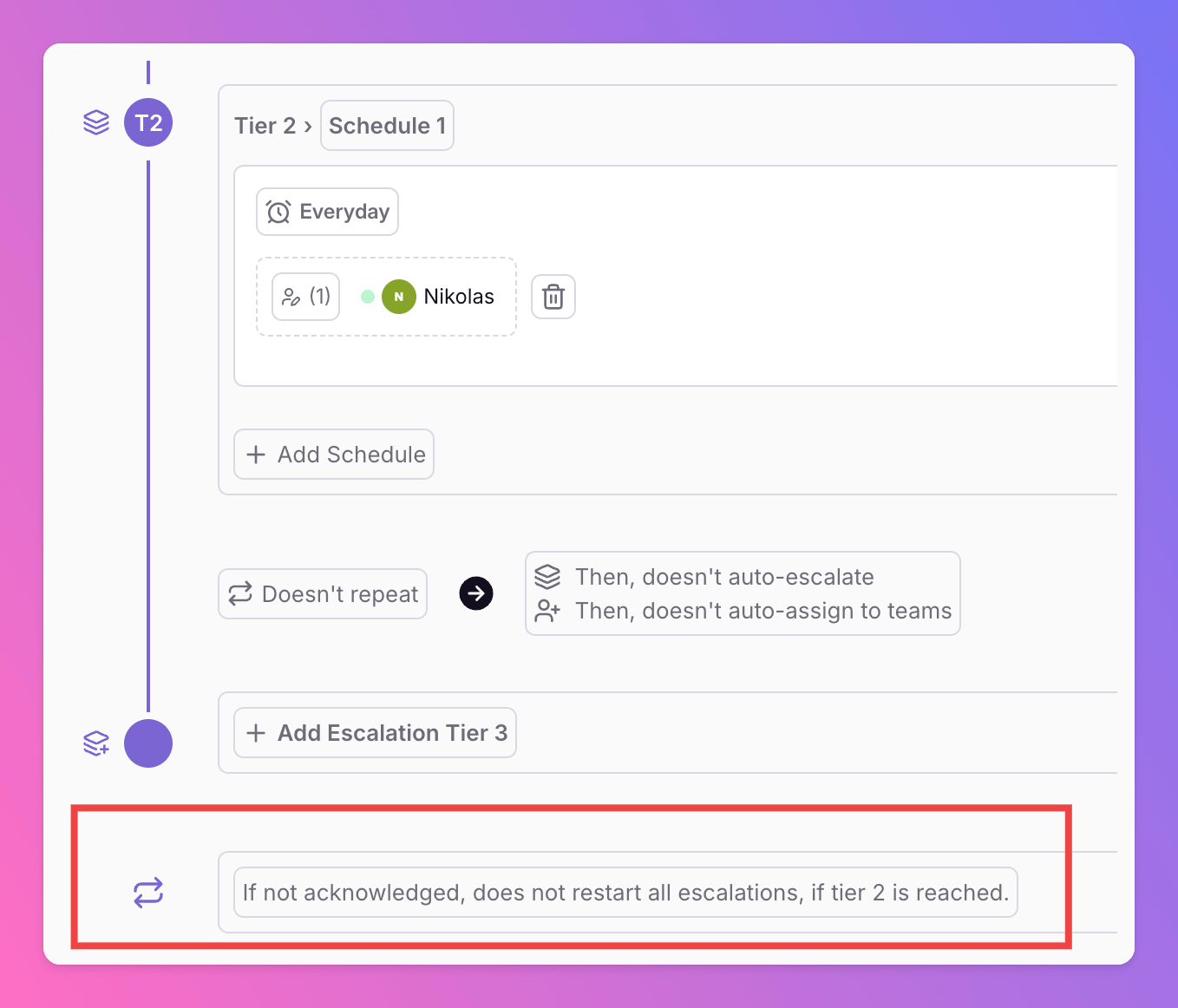 The repeat and auto-escalate features can, of course, be combined. This allows you to notify Tier 1 multiple times before automatically escalating the incident if no one acknowledges / resolves it.