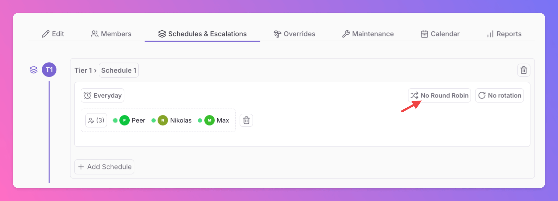 - I’ve enabled Round Robin with a size of 2. For each incident, instead of alerting all three on-call colleagues, we will notify only two, rotating the selection for each incident.